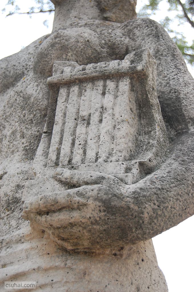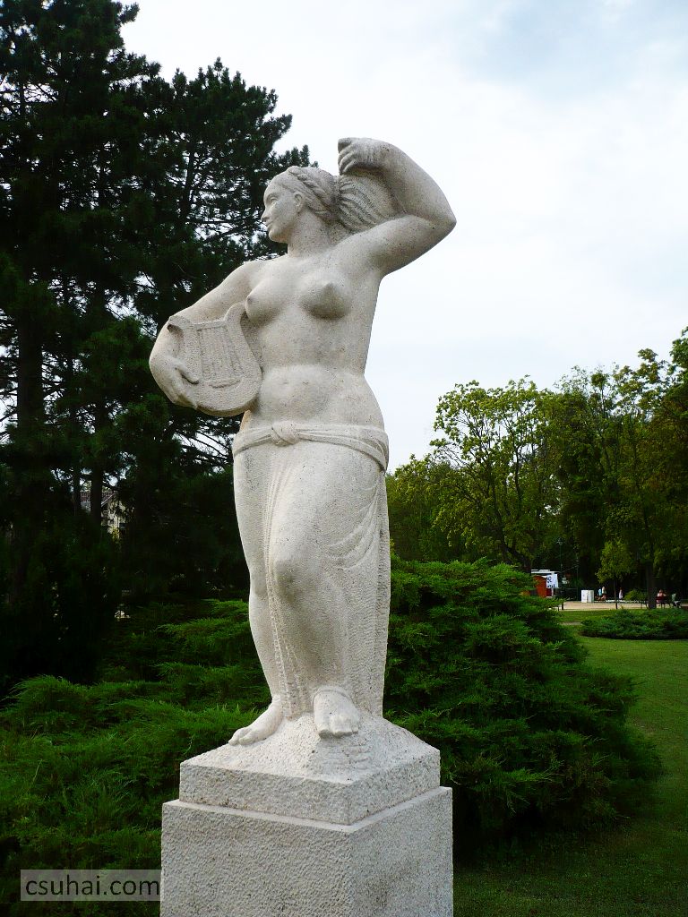 Kocsis keszthelyi szobra a fentebb említett Fortepan-gyűjteménynek köszönhetően amúgy is helyzeti előnyben van, mivel törött lantos agyagváltozatáról létezik korabeli műtermi felvétel (jobboldalt, a sarokban a Horváth-kert déli szögletében 1960-ban felavatott Haydn-emlékmű büsztje, baloldalt hátul a pestújhelyi Tavasz kar nélküli nőalakja), jöjjön inkább befejezésül a nagyon moderáltan összeválogatott körbe-körbe a két szoborról, most már a teljes alakos képek is. Előbb kísérőszöveg nélkül az összehasonlíthatatlanul előnyösebb térben, a víztől húsz méternyire álló keszthelyi szobor.