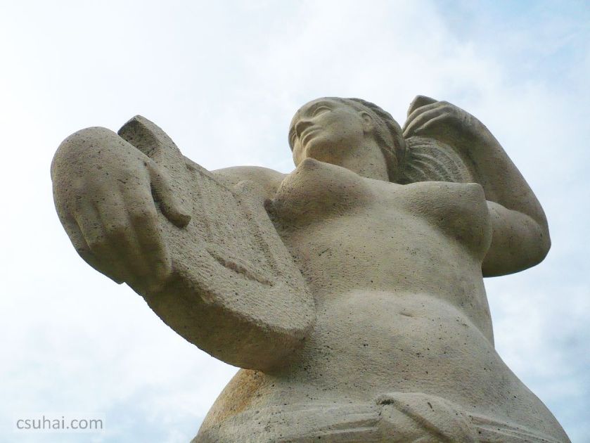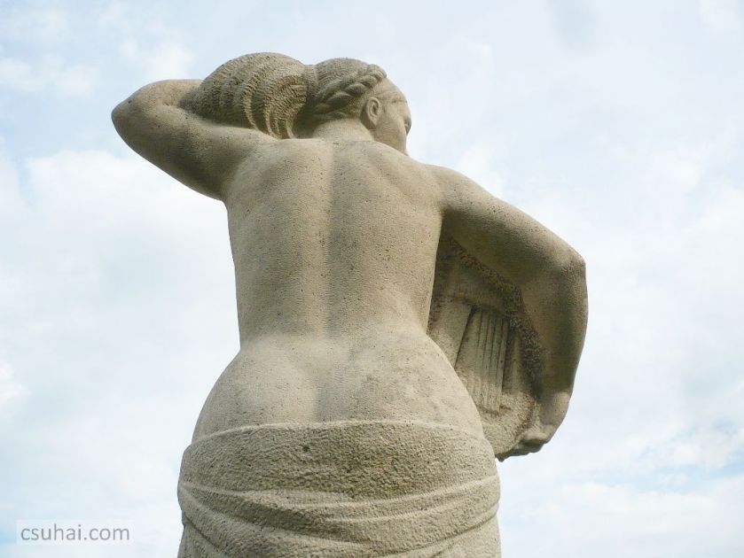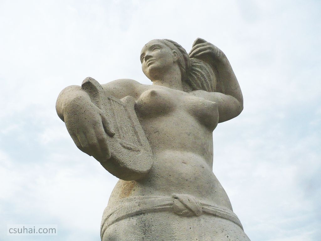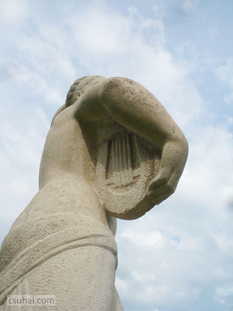 Eredetileg ezen a helyen csak Kocsis András Helikon című szobráról akartam írni, elsősorban a blogban immár kézzelfogható szálat jelentő, többször emlegetett “Balaton kapuja”-koncepció keretében (itt, itt és itt volt szó erről), de ahogy ez lenni szokott, a dolgok túlfeszítették saját keretüket. Magát a szobrot, a Helikont kétszer is (először 2009-ben, másodszor 2014 nyarán több ízben, már a blogra tekintettel) fotóztam, de aztán a képeket kiválogatva eszembe jutott Pándi Kiss János a balatonszárszói kikötőben álldogáló lantos nője, amit viszont 2012 óta minden nyáron, kora reggeltől sötétedésig számtalan alkalommal fényképeztem már le. Azonos a két szobor közelebbi szobrászati kategóriája (mindkettő ugyanazzal a hangszerrel, lanttal a kezében álló nő), státusuk, funkciójuk is hasonló (mindkettő egy-egy balatoni kikötő sétálórészén elhelyezett díszítőszobor, Győri Dezső boglári Tornászlányához hasonlóan), a köztük lévő bő tíz éves korkülönbség ellenére szegről-végről ugyanannak a korszaknak a leányai, és még a két szobrász, Kocsis András és Pándi Kiss János között is jócskán van hasonlóság. A legfontosabb ezek közül az, hogy mind a ketten 1905-ben születtek, Kocsis Kolozsváron, Pándi Kiss a művésznevébe belefoglalt Pándon; Kocsis már visszavonultan, új szobrot utolsó éveiben nem állítva, 1976-ban halt meg, Pándi Kiss öt évvel később, 1981-ben. A generációs közösségen túl akad néhány egyéb párhuzam is — és ugyan érintőlegesen mindkét szobrász szerepelt már a blogon, saját szoborral, önálló posztban bemutatva eddig még nem (ha csak Kocsis sokféleképpen emlegetett Népstadion-beli