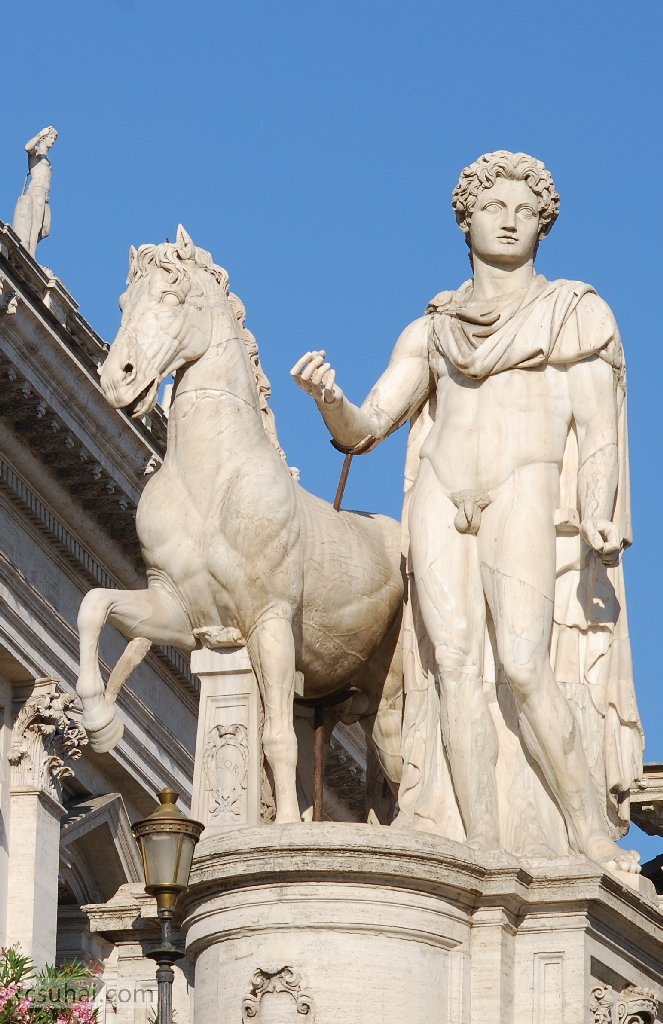 a Capitoliumra vezető lépcsősor tetején ott várakozó párosnál, Castornál és Polluxnál,
