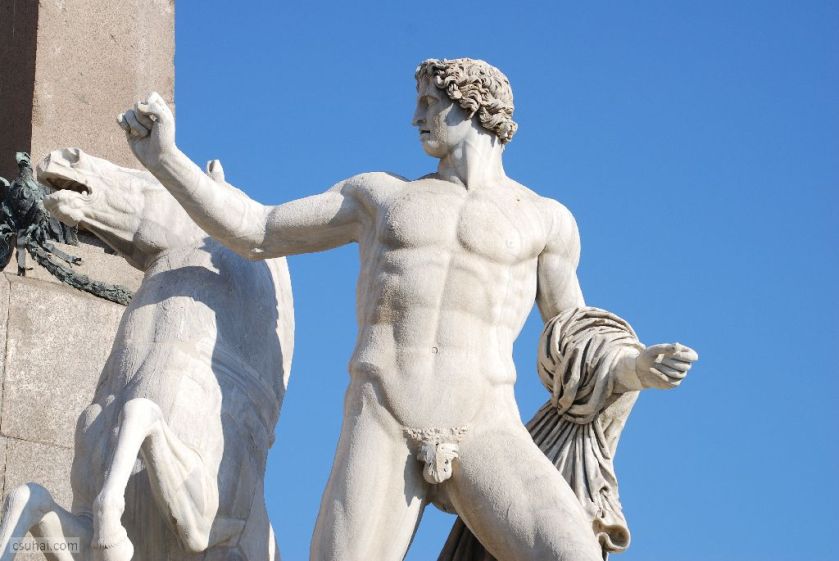 (Csak zárójelbe kívánkozó mellékszál, hogy a római páros számtalan szobrászt ihletett meg világszerte, én itt 2004-es saját képpel csak a szentpétervári változatból tudok megmutatni egy részletet, Peter Klodt von Urgensburg 1851-ben a Fontanka felett átívelő Anyicskov-hídon elhelyezett kvartettjéből az egyiket,