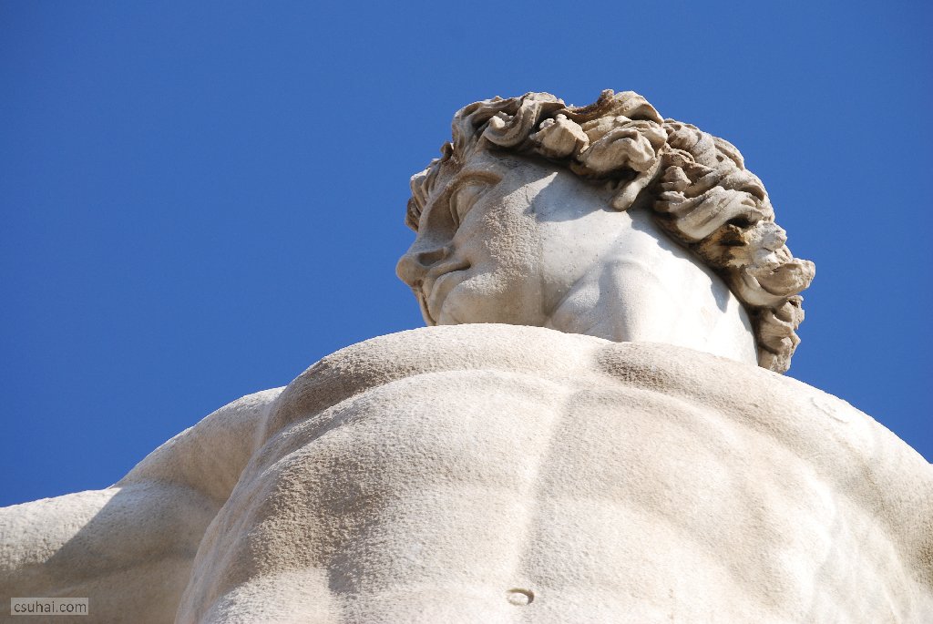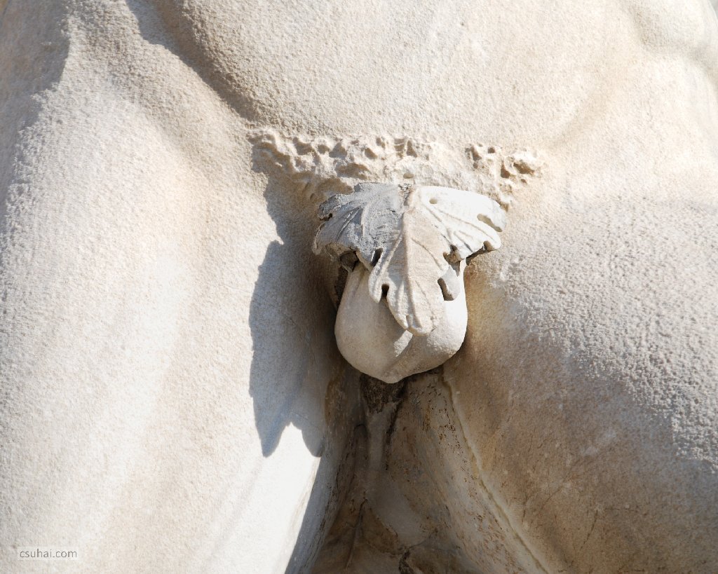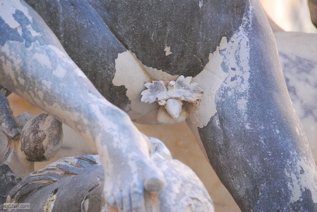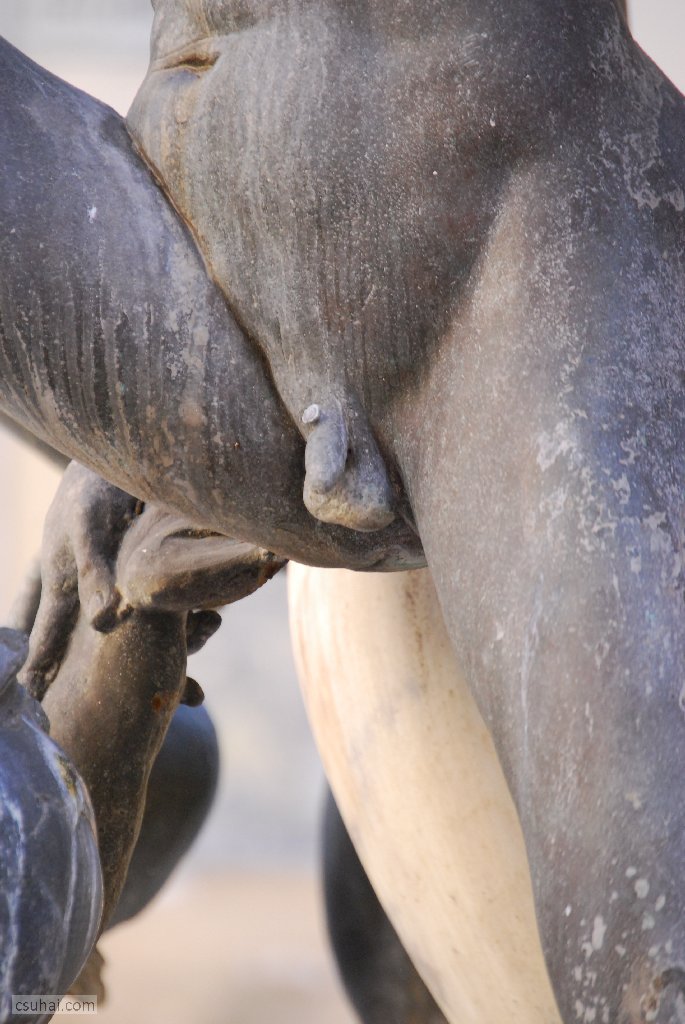 Szinte érzem, ahogy férfiolvasóim e pillanatban összerántják térdüket, ölben meggörnyednek (és erre lesz még okuk pár kép múlva is). Azt is elfogadom, hogy amit ma itt látunk, az az elmúlt 5–10–15 év rongálása, vagy a városi szennyezés olyan eredménye, amiben semmi szerepe nincs a közvetlen szándékosságnak. De az egész azt is érzékelteti, hogy a köztéri aktszobor koronként állandó mozgásban, változásban van, prüdéria és szabadosság csapatai harcban állnak, hogy adott időben vajon éppen mi tehető közszemlére és mi minősül rejtegetni valónak. És talán nem túlzok, ha azt állítom, hogy ami ma ebben az intim szoborban, hozzá illő elhelyezésében olyan finoman benne van, annak nincs sok köze della Portához vagy Landinihez. Közhely, hogy a meztelenség nyilvánosságra hozatalához a középkor kezdetétől a XVII. századig tiltások és tabuk kötődtek; közhely az is, hogy ezt a szigort éppen az egyházi művészet kezdte oldani. Könnyen elképzelhető tehát, hogy az 1580-as évekhez, eredeti megformálásához képest ez a gyönyörű, homoerotikus kútszobor évszázadonként akár jelentősen is át-átalakult — és ma éppen ilyen a megjelenése; azért látjuk ilyennek, mert több mint négy évszázad jelentésadása rakódott rá. A hiányzó fügefalevél/szeméremszőrzet mindössze finom jelzése ennek az állapotnak.