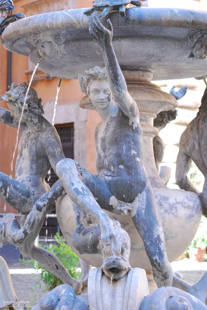 Az egyik az 1581–1588 között Giacomo della Porta tervei szerint, a firenzei szobrász, Taddeo Landini szobraival megépített Teknősbékás szökőkút, melyet négy delfinre támaszkodó, magasba nyúló meztelen fiatal fiú tölt ki (maga a hárommedencés kút három kávája három különböző márványból készült, a névadó teknősbékák valószínűsíthetően száz évvel később, a kút egyik restaurálásakor, az 1680-as években, Bernini munkájaként kerültek a felső kútmedence szélére). Ha a négy nyúlánk fiút közelebbről nézzük,