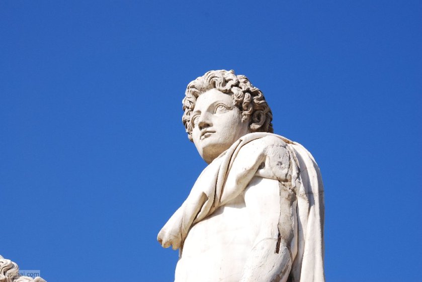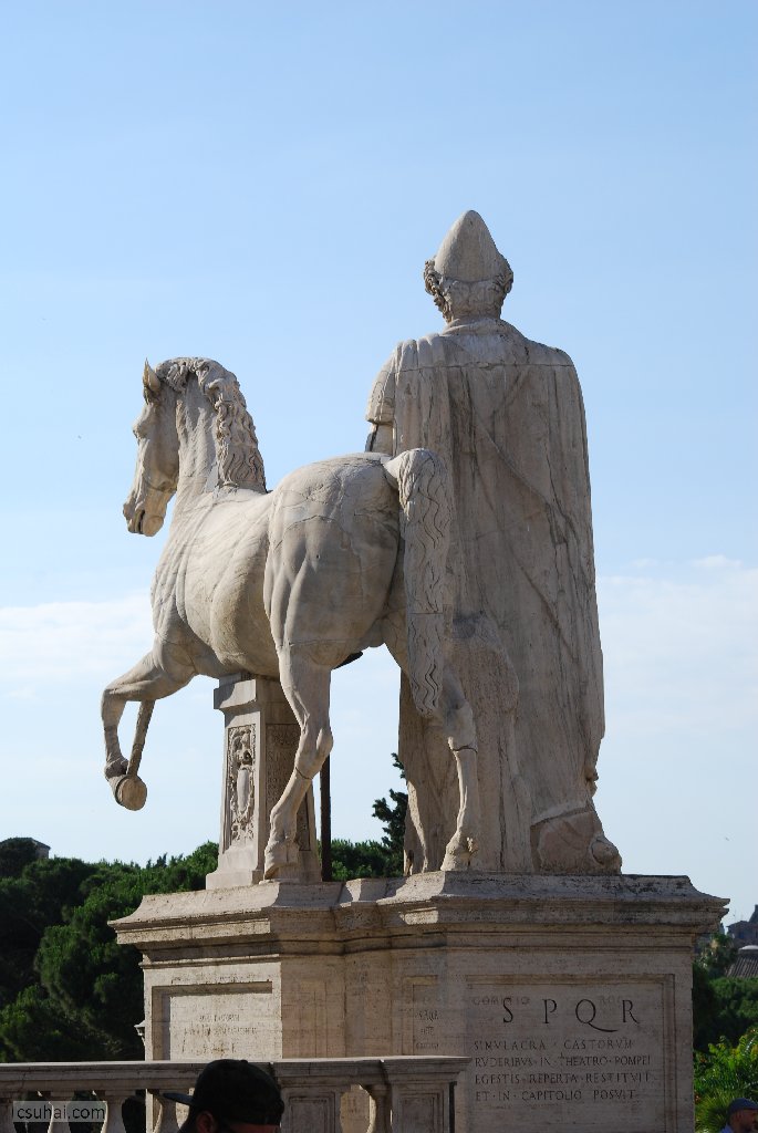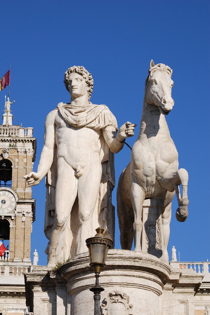 a Capitoliumra vezető lépcsősor tetején ott várakozó párosnál, Castornál és Polluxnál,