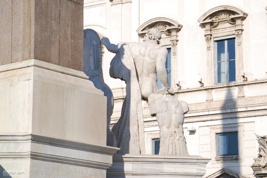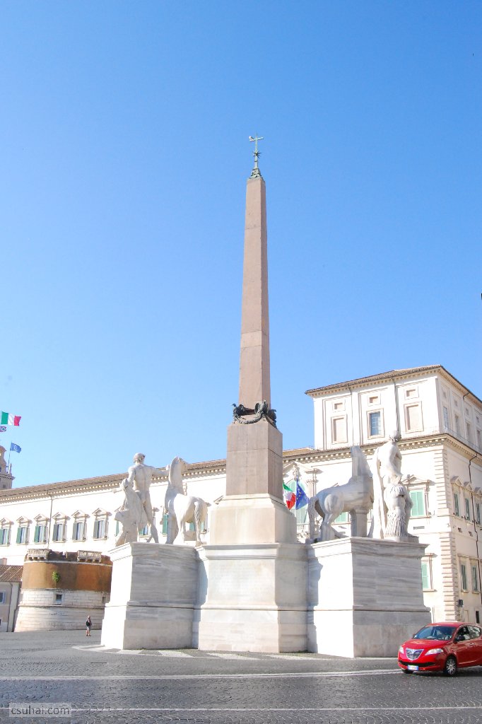 a tér sarkán, a ragyogó júniusi római napsütésben ott áll hófehéren, a szokásos vörösköves obeliszkes római kiszerelésben a londoni Achilles/Wellington két előképe,