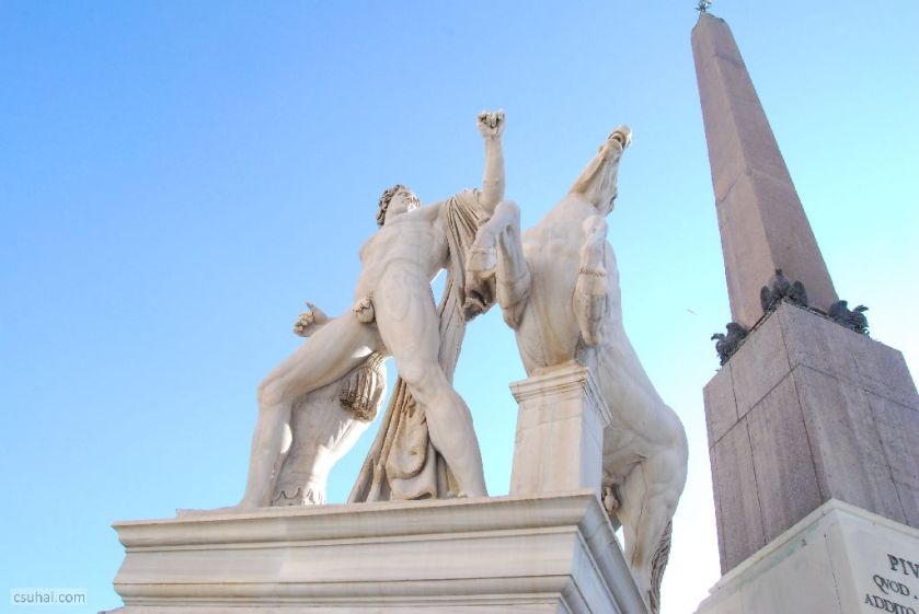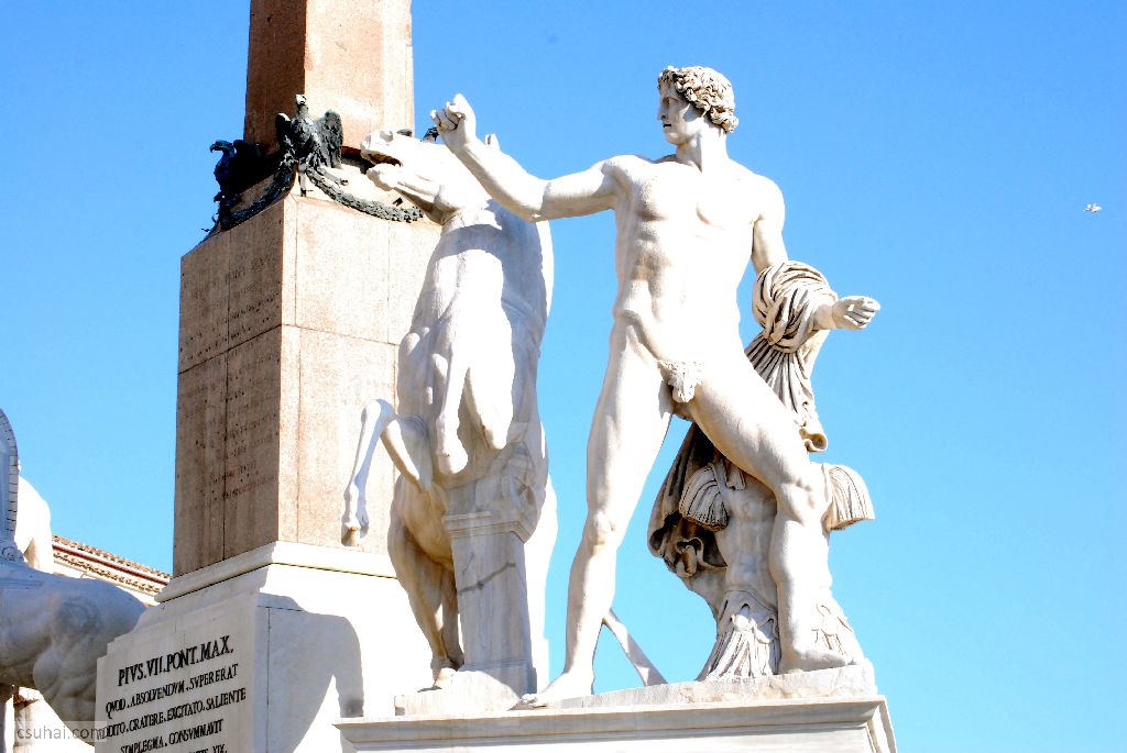 A jelentős római köztéri szobrok talapzatán mindig nagyobb előszeretettel tüntetik fel az állíttató (rendszerint valamelyik pápa) nevét, mint az alkotóét. A talapzaton olvasható adat ezúttal nem a két szoborra, hanem a köztük lévő obeliszk elhelyezésére vonatkozik, VII. Pius pápaságára, aki 1800 és 1823 között ült a pápai trónon — Westmacott az Achillesen nem kortárs művet másolt tehát, hiszen a két márványszobor, az obeliszk nélkül, már a IV. század óta nagyjából ugyanezen a helyen állt. Történetesen a Quirinálén álló kompozíció hátoldalán