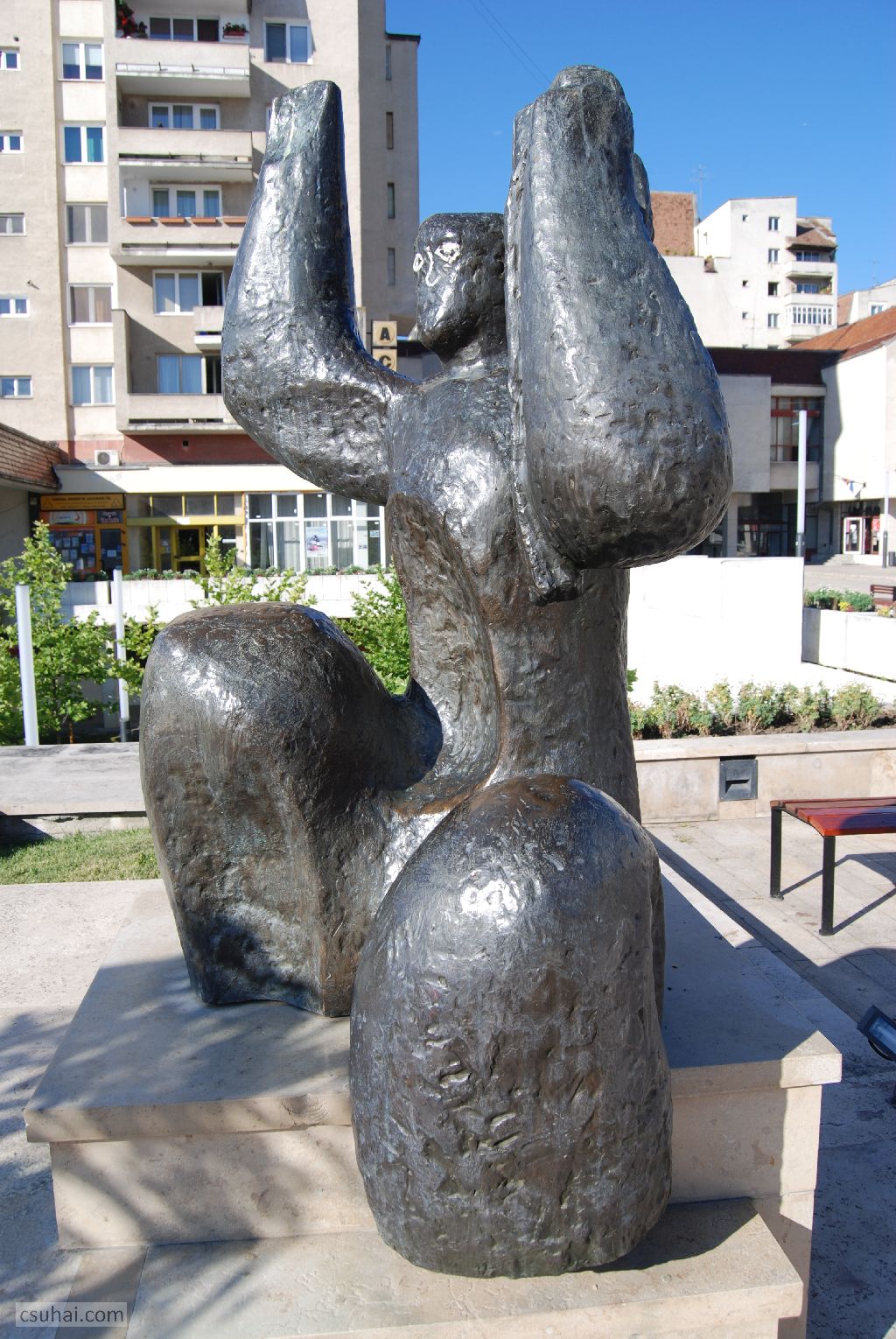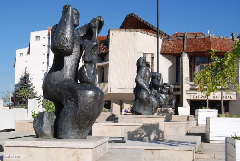 Egy hónappal később, Marosvásárhelyen modernista lettem mindenestül, ami persze csak most a blogból látszik így, mert azért épp eleget foglalkoztam régebbi Köztérképes vásárhelyi lapjaim (a most már a város újkeletű ikonjának számító, a Teleki Téka előtt sréen álló Pszeudoszféra című Bolyai-emlék, a Petőfi-szobor, a Holokauszt emlékmű, a Rákóczi-mellszobor, a Szentgyörgyi István-büszt és a Borsos Tamás-installáció) csinosítgatásával. Ezek azonban mind 1990 után, sőt inkább a 2000-es években állított szobrok, akiket közelebbről érdekelnek, a fenti hivatkozásokon elolvashatják, mit írtam róluk feltöltésükkor, még 2010-ben. Most nyáron a hatvanas évek ottani magyar absztrakt szobrászata érdekelt, és a vásárhelyi színház előtti téren két jelentős darab is ott áll ebből a korszakból, ebből a stílből. Közel laktam hozzájuk, a nap minden szakában tudtam fényképezni őket (itt teszem hozzá, akit az időjárás bonyodalmai érdekelnek, tizenegy idei erdélyi napom alatt, se június végén, se július végén nem láttam egyetlen csepp esőt sem, noha felhőt rengeteget). Mind a két szoborcsoport egy 1963-ban kiírt pályázaton legalizálta önmaga köztéri létét, mind a kettőt időben közel egymáshoz, 1963 végén, 1964-ben, az új városi tér kialakításakor állították, mind a kettőt 2010-12 során, a tér legutóbbi felújításakor restaurálták és állították újra.
