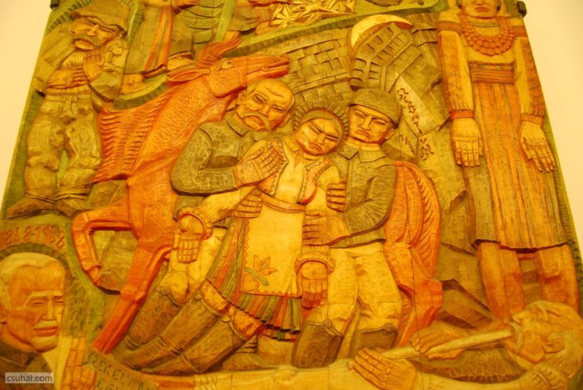 mert ilyen viszont biztosan nem fog velünk lépten-nyomon szembejönni: Szervátiusz Jenő (1903–1983) Ballada című, 1969-ben készült, a Székely Dalegylet száz évét (1868-1968) megünneplő színezett fa domborművéről van szó,
