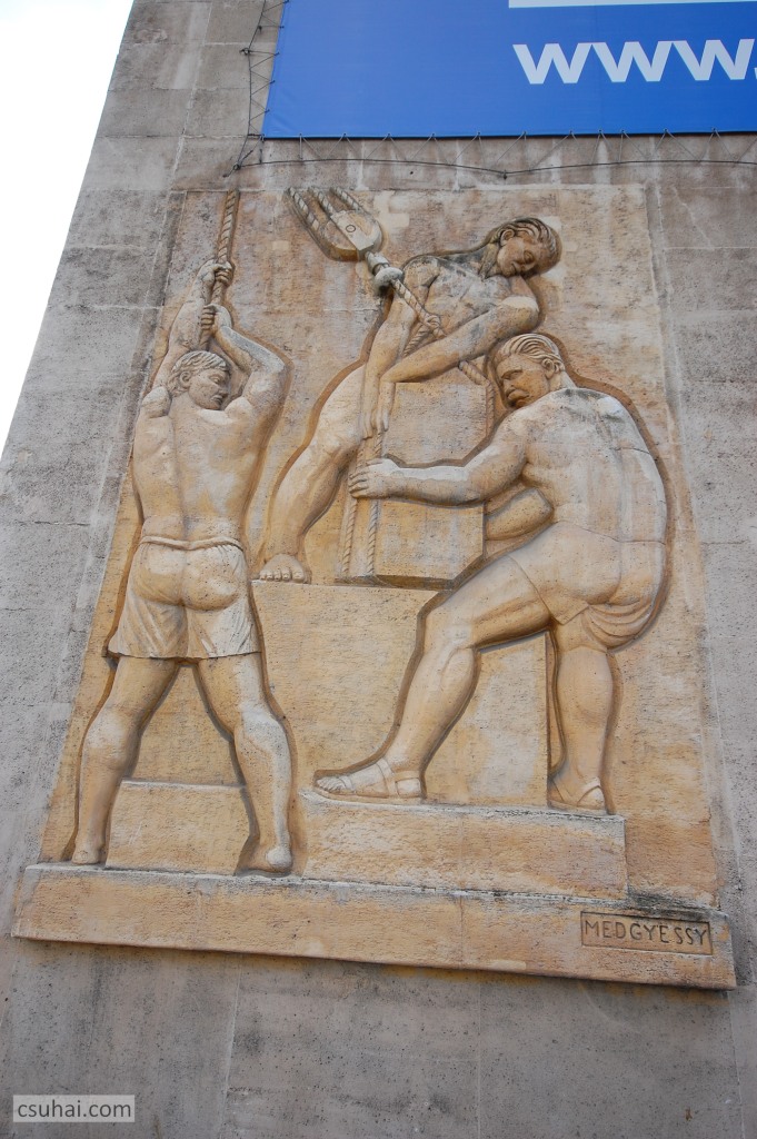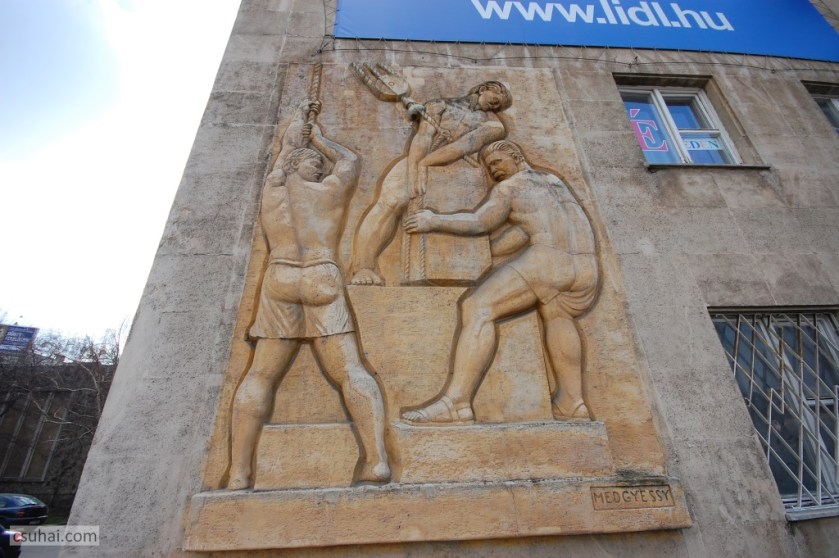 És ha már eddig domborműről volt szó, legyen elsőként Megyeri Barnától szintén egy dombormű, mégpedig az 1954-re az Újlipótvárosban felépült belügyminisztériumi garázs Balzac utcai oldaláról,