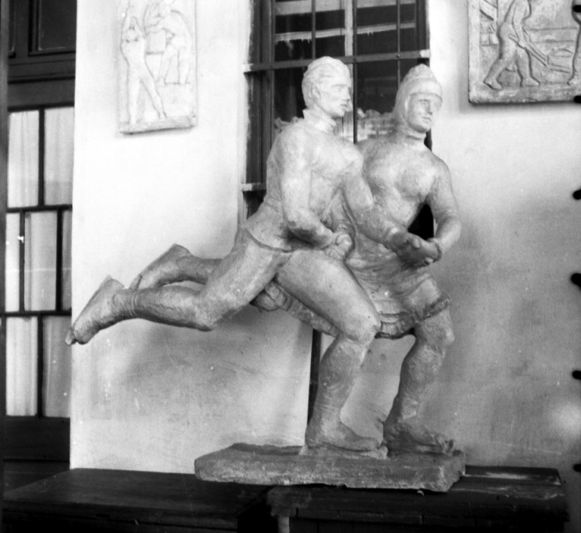 hogy a korcsolyázó, jégtáncos párost (!) ábrázoló szobor mögött balra, a háttérben jól látható Medgyessy Hídépítők című, 1950-ben a József Attila Színházzal egy tömbben lévő angyalföldi  lakóépület Róbert Károly körút felé eső oldalán elhelyezett monumentális reliefjének a kis változata, ezt a domborművet pedig