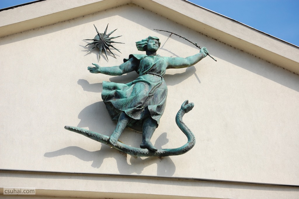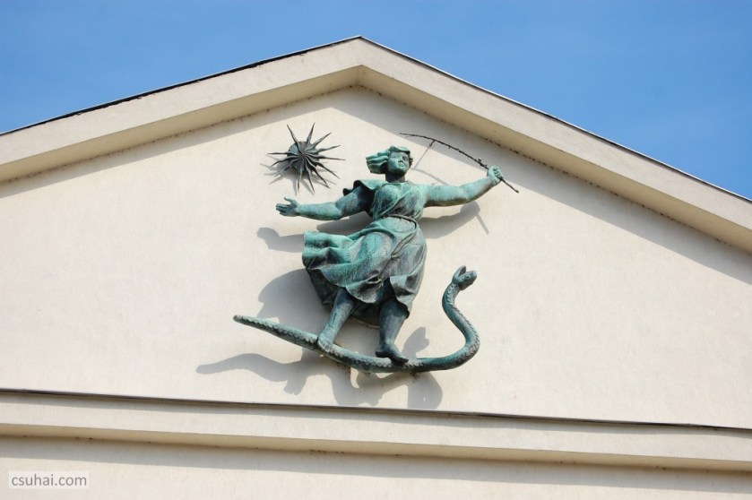 És csak kisebb részt érvényesül az 1954-ben felépített miskolci rendelőintézet timpanonjában 1960-ban elhelyezett, a gyógyítás allegóriájaként megformált fali díszítőszobornál (a kép előterében Marosán László ugyancsak 1960-ban felállított Korsós nője látható; a timpanon-szobrot és a korsós nőt is egy-egy külön dédelgetett terv, sorozat már lefényképezett darabjaiként veszem ide),