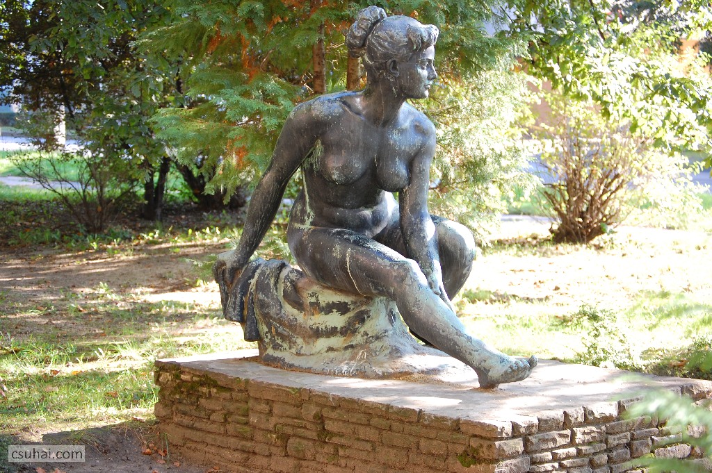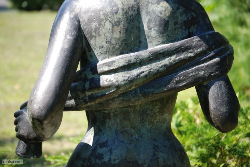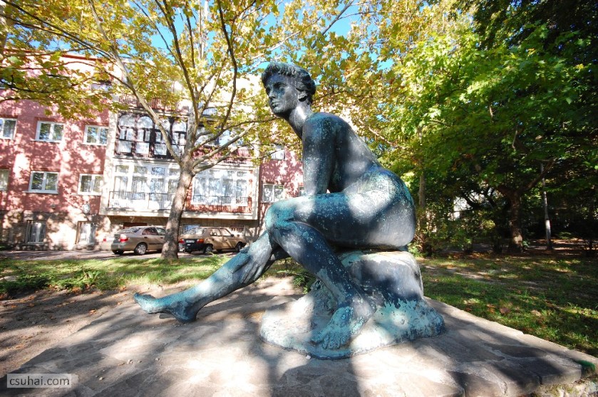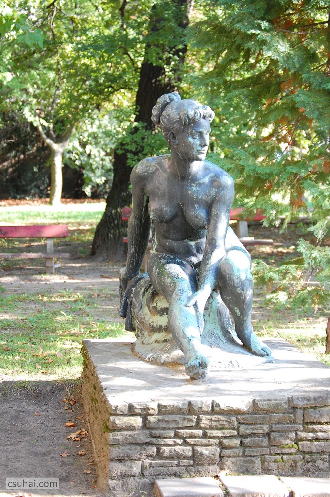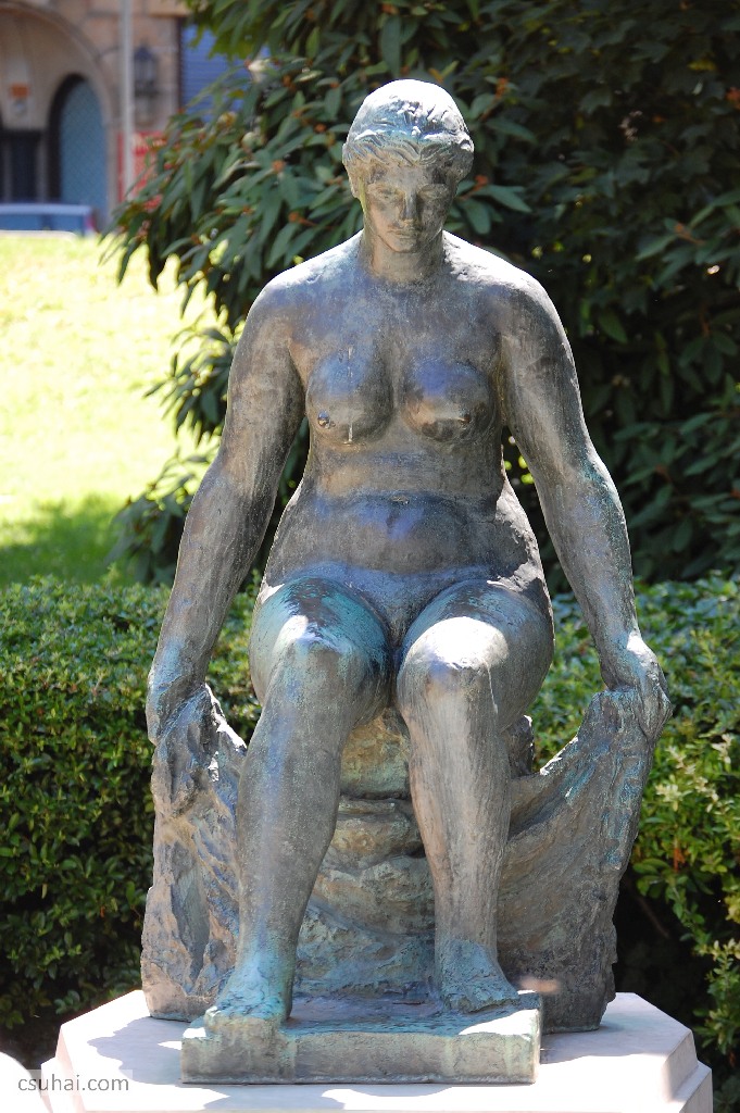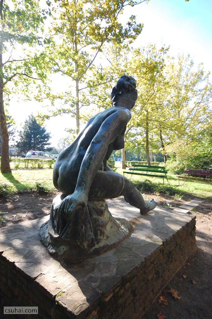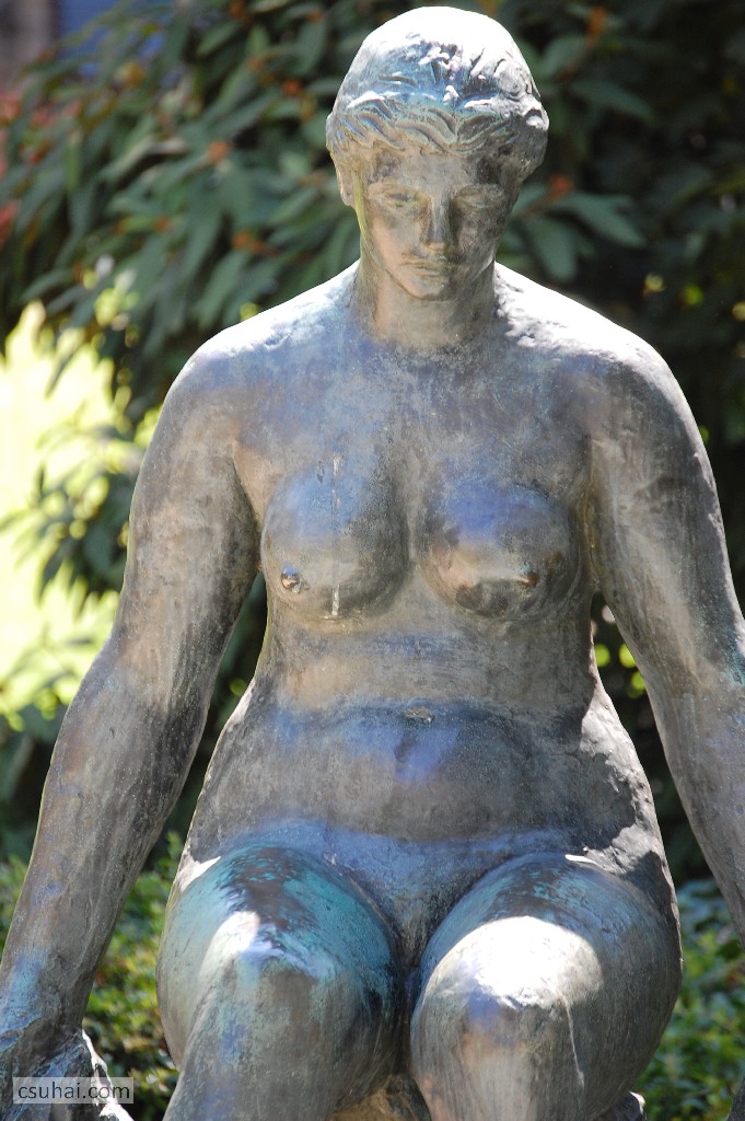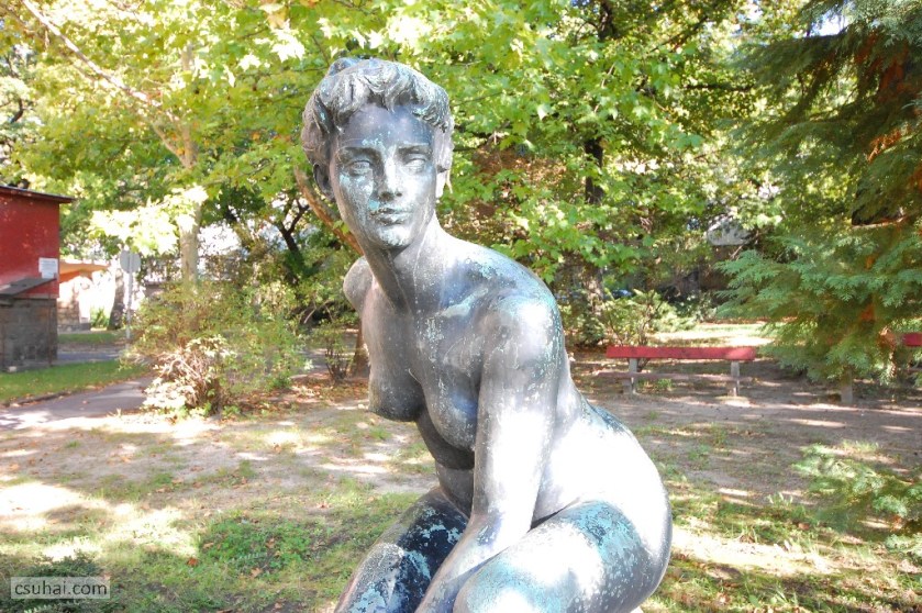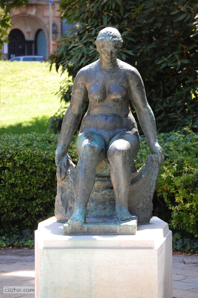 De aki ismeri a blogot, tudja jól, hogy imádom szaporítani a szót, és ezt, a szószaporítást most sem fogom megállni. Néha a szó szoros értelmében addig kell szaporítanom, míg a szó éppen ahhoz a képhez ér, amihez érnie kell; ez sohasem történik fordítva. Mindezt zárójelbe kellett volna tennem. Három, nagyjából egyforma méretű, azonos technikájú, hasonló zsánerű köztéri szobor jön itt, mind a három meztelenül ülő nőt ábrázol nagy fokú anatómiai pontossággal, (mész)kő posztamensen bronzból, az életnagyságnál a köztéri szobrászati méretkonvenciókhoz igazodó nagyobb megformálásban, de nagyjából nézőjük közvetlen perspektívájában. Eredetileg mind a hármat vízmedence vehette körül, ezek közül ma már csak a legexponáltabb helyen, a Horváth-kert északnyugat felé eső oldalában üldögélő Ferenczy Béni-féle nő részesül ebben a jótéteményben, a három évszám pedig, azon túl, hogy behatárolja ennek a szoborblognak az egyik központi időszakát, módot ad arra is, hogy megfigyelhessük, a klasszikus zsáner, az ülő nő témája lépésenként hogyan korszerűsödik, úgy persze, hogy a figuralitás szabályrendszerét végül sehol, egy pillanatra sem szegi meg az egyik darab sem. És hát persze a három szobrász közül Ferenczy Béni volt ugyan a nagy, szótlan mester, a három szobor legalábbis itt, ebben a sorban mégis úgy hat, mintha egymás folytatásai lennének. De ez csupán látszat, senki ne dőljön be neki.