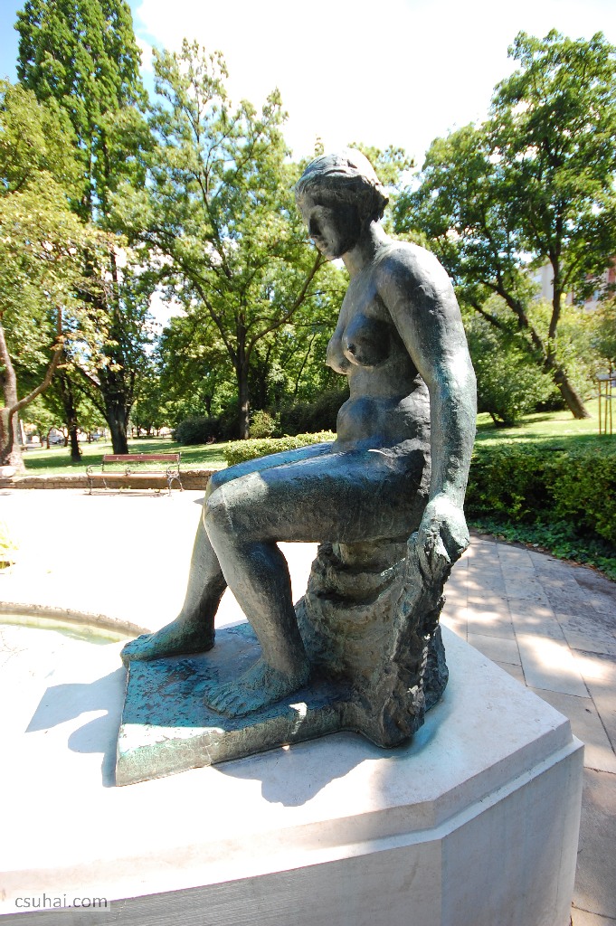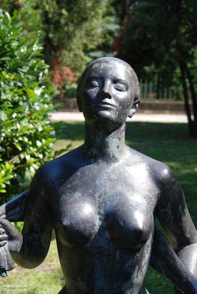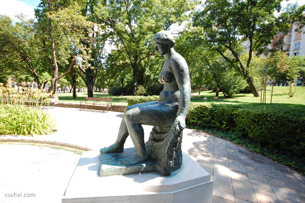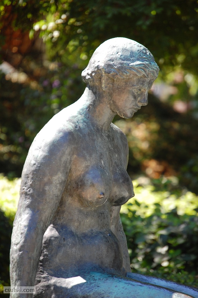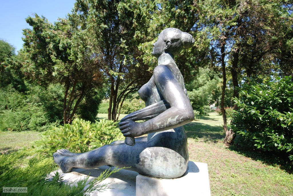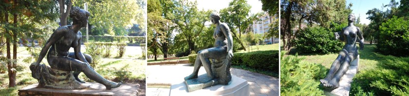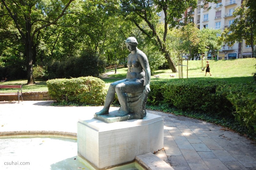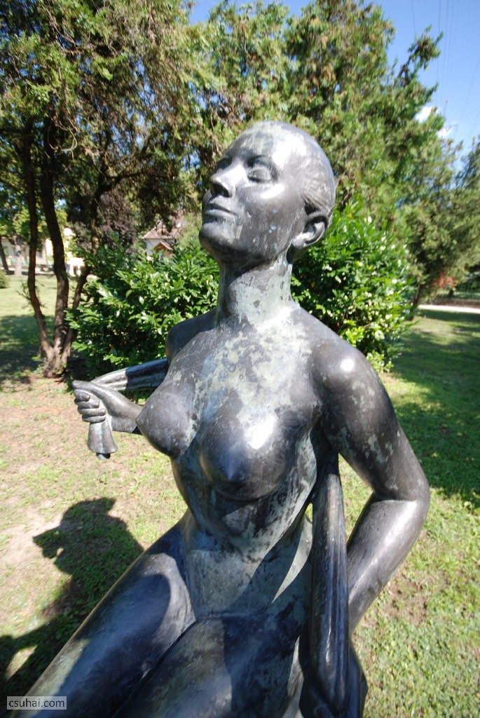De aki ismeri a blogot, tudja jól, hogy imádom szaporítani a szót, és ezt, a szószaporítást most sem fogom megállni. Néha a szó szoros értelmében addig kell szaporítanom, míg a szó éppen ahhoz a képhez ér, amihez érnie kell; ez sohasem történik fordítva. Mindezt zárójelbe kellett volna tennem. Három, nagyjából egyforma méretű, azonos technikájú, hasonló zsánerű köztéri szobor jön itt, mind a három meztelenül ülő nőt ábrázol nagy fokú anatómiai pontossággal, (mész)kő posztamensen bronzból, az életnagyságnál a köztéri szobrászati méretkonvenciókhoz igazodó nagyobb megformálásban, de nagyjából nézőjük közvetlen perspektívájában. Eredetileg mind a hármat vízmedence vehette körül, ezek közül ma már csak a legexponáltabb helyen, a Horváth-kert északnyugat felé eső oldalában üldögélő Ferenczy Béni-féle nő részesül ebben a jótéteményben, a három évszám pedig, azon túl, hogy behatárolja ennek a szoborblognak az egyik központi időszakát, módot ad arra is, hogy megfigyelhessük, a klasszikus zsáner, az ülő nő témája lépésenként hogyan korszerűsödik, úgy persze, hogy a figuralitás szabályrendszerét végül sehol, egy pillanatra sem szegi meg az egyik darab sem. És hát persze a három szobrász közül Ferenczy Béni volt ugyan a nagy, szótlan mester, a három szobor legalábbis itt, ebben a sorban mégis úgy hat, mintha egymás folytatásai lennének. De ez csupán látszat, senki ne dőljön be neki.