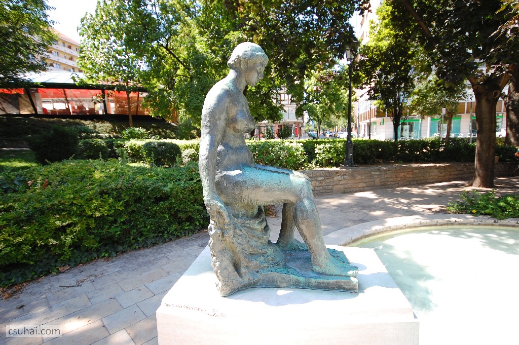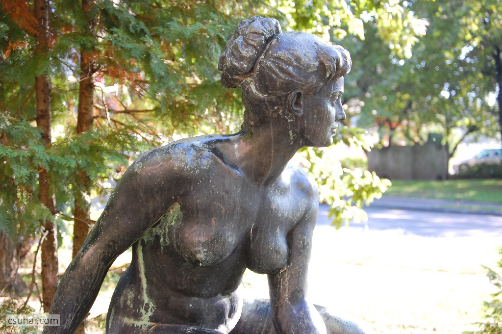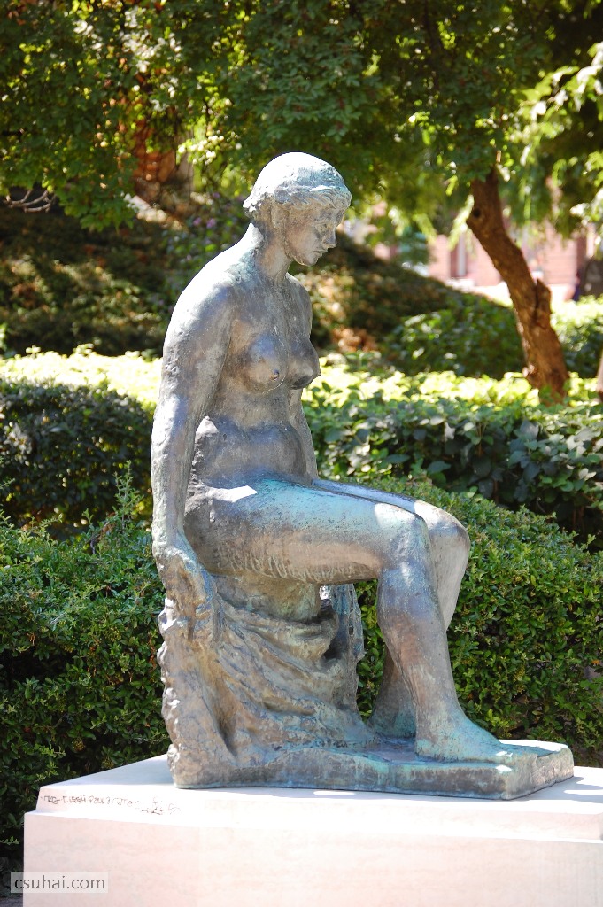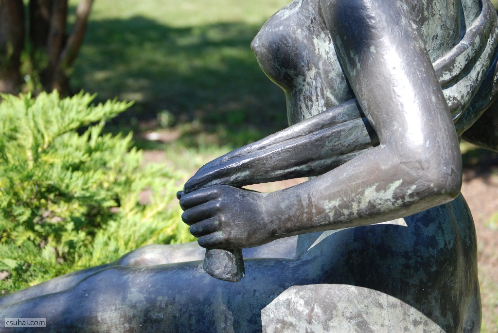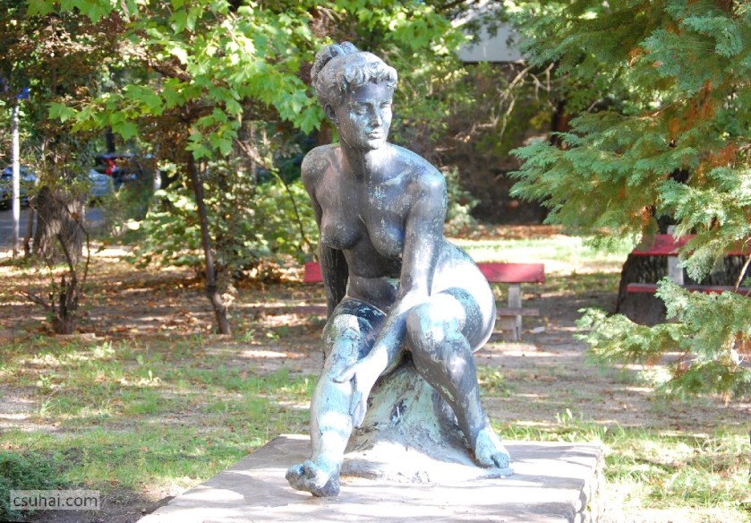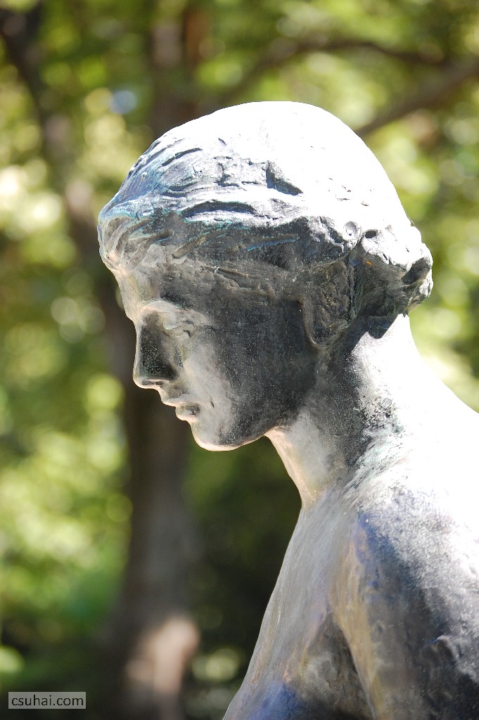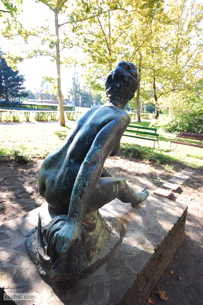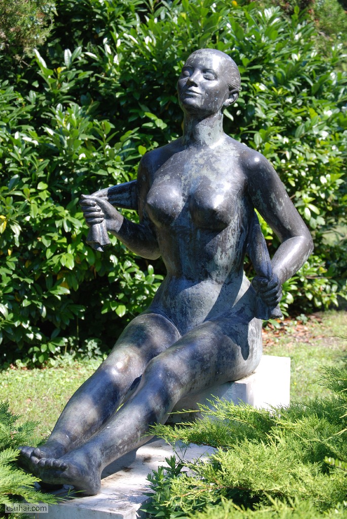 De aki ismeri a blogot, tudja jól, hogy imádom szaporítani a szót, és ezt, a szószaporítást most sem fogom megállni. Néha a szó szoros értelmében addig kell szaporítanom, míg a szó éppen ahhoz a képhez ér, amihez érnie kell; ez sohasem történik fordítva. Mindezt zárójelbe kellett volna tennem. Három, nagyjából egyforma méretű, azonos technikájú, hasonló zsánerű köztéri szobor jön itt, mind a három meztelenül ülő nőt ábrázol nagy fokú anatómiai pontossággal, (mész)kő posztamensen bronzból, az életnagyságnál a köztéri szobrászati méretkonvenciókhoz igazodó nagyobb megformálásban, de nagyjából nézőjük közvetlen perspektívájában. Eredetileg mind a hármat vízmedence vehette körül, ezek közül ma már csak a legexponáltabb helyen, a Horváth-kert északnyugat felé eső oldalában üldögélő Ferenczy Béni-féle nő részesül ebben a jótéteményben, a három évszám pedig, azon túl, hogy behatárolja ennek a szoborblognak az egyik központi időszakát, módot ad arra is, hogy megfigyelhessük, a klasszikus zsáner, az ülő nő témája lépésenként hogyan korszerűsödik, úgy persze, hogy a figuralitás szabályrendszerét végül sehol, egy pillanatra sem szegi meg az egyik darab sem. És hát persze a három szobrász közül Ferenczy Béni volt ugyan a nagy, szótlan mester, a három szobor legalábbis itt, ebben a sorban mégis úgy hat, mintha egymás folytatásai lennének. De ez csupán látszat, senki ne dőljön be neki.