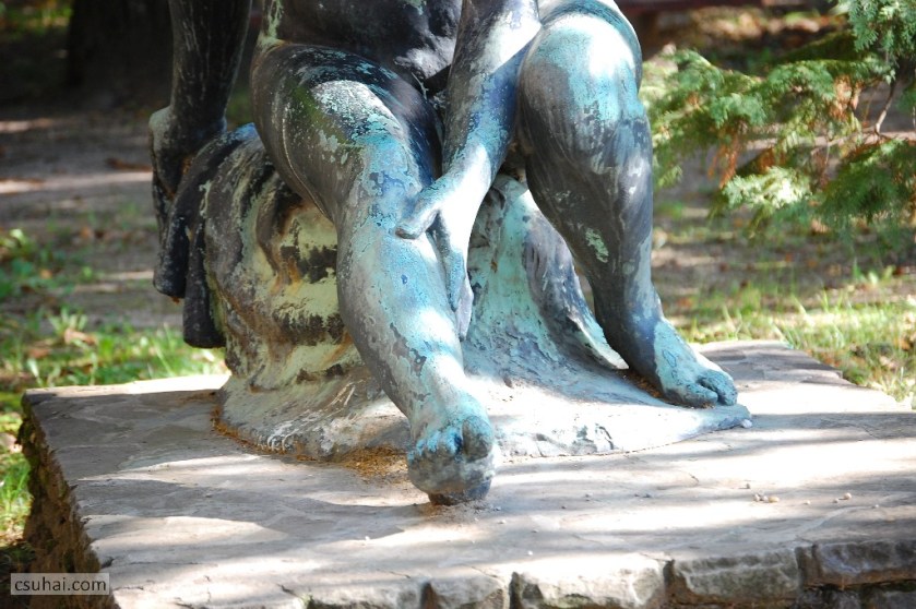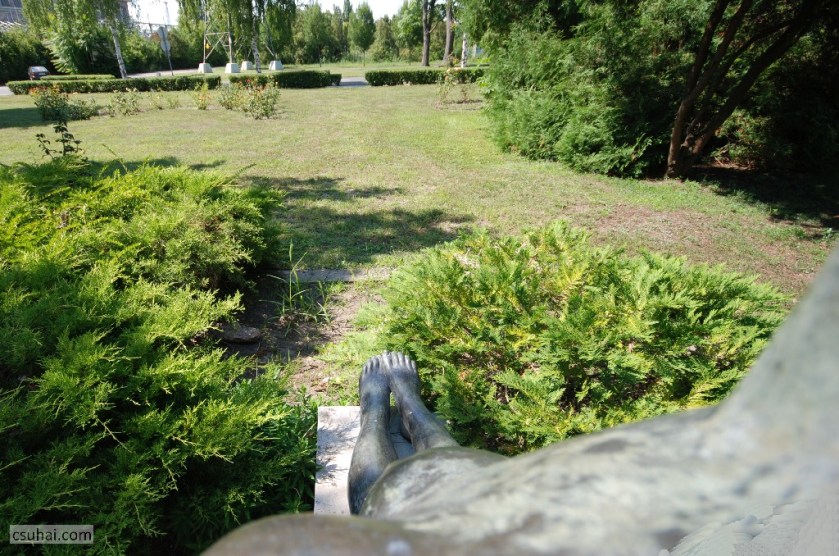 (Zárójelben teszem hozzá, mert a mellékelt képekből nem egészen jön át, hogy mai környezete az egyébként dicséretesen felnövekedett, de gondozatlan vegetáció következtében szűkösnek hat, a szobor a szellős tér hiánya miatt jóval, aránytalanul nagyobbnak tűnik, mint amekkora valójában — tudat alatt valószínűleg ezért is hanyagoltam eddig, mert nem a róla készült fényképek, hanem 2014-es valóságos élményeim éltek bennem vele kapcsolatban.)