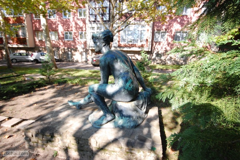 Mindenesetre finomítanom kell a bevezető résznek azt a megjegyzését, amely túlságosan nagy jelentőséget tulajdonított az 1967-es felállítási évnek — a hátulnézetből jól látható, hogy a szobrász a törölközőre mesterjegyét és a készítés évszámát is odavarázsolta, az pedig 1964, a három év csúszásnak meg inkább városfejlesztési okai lehettek, mint cenzurálisak vagy ideológiaiak,