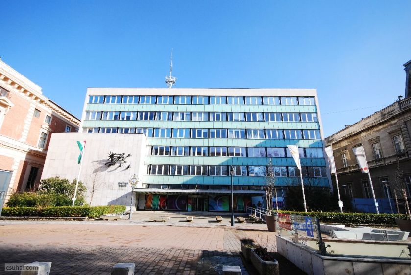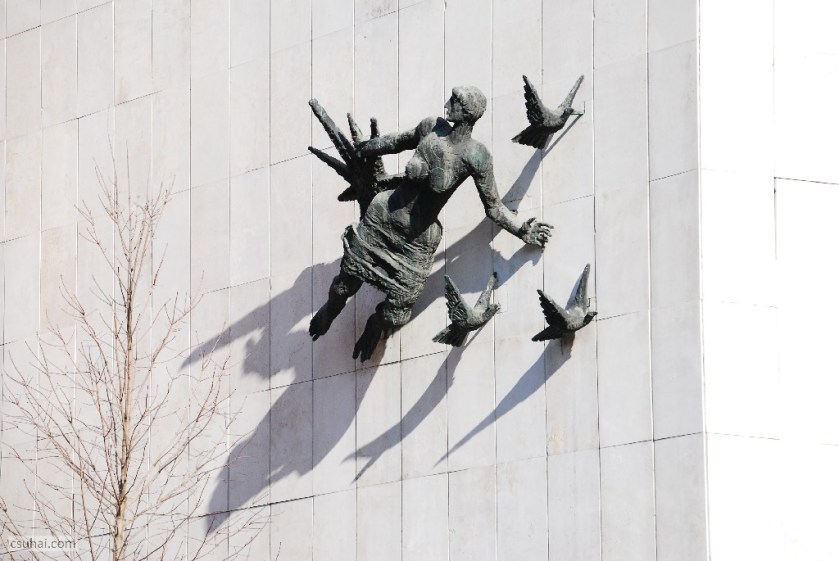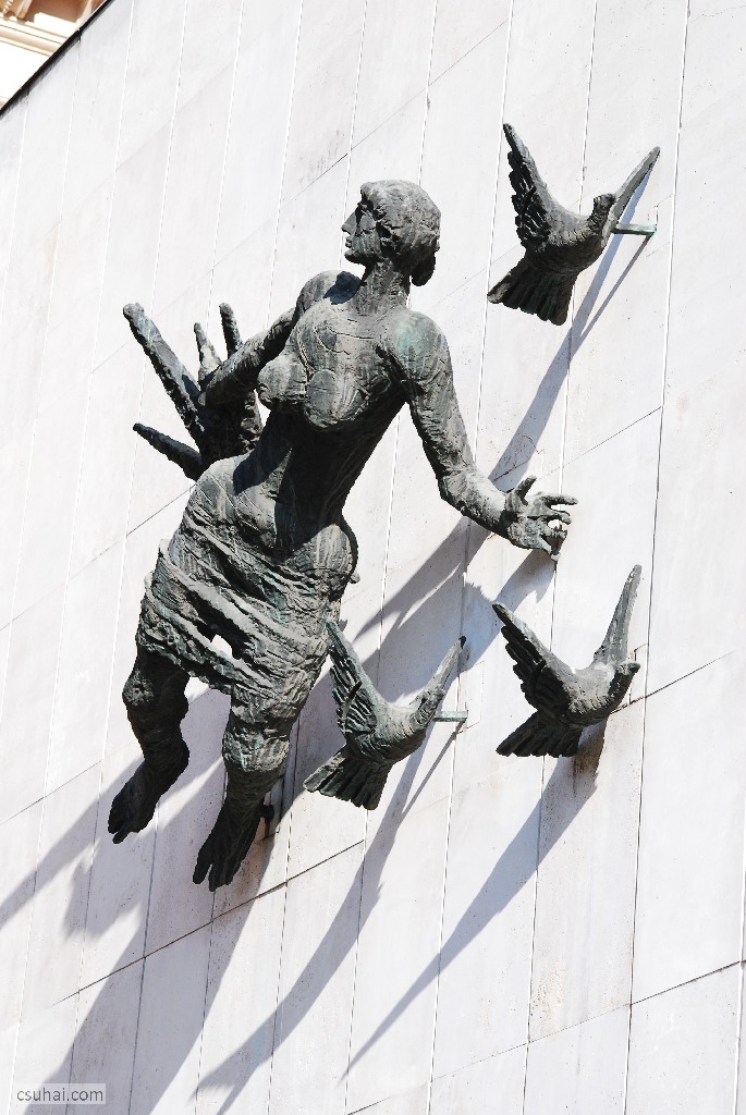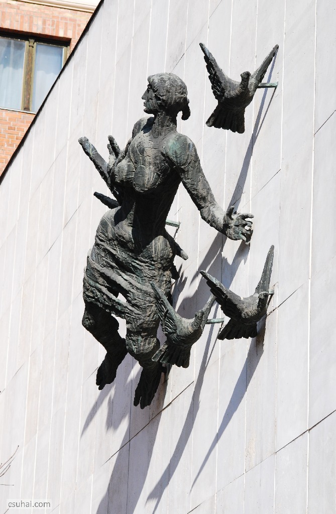a címe szerint (Tudomány és Művészet) eredetileg alighanem allegóriának szánt monumentális fali szoborról. Mára minden ideológiailag érzékeny kortársa eltűnt a helyéről, cukiszobrok tucatja népesíti be most a főteret, alighanem itt a legmagasabb az országban az egy négyzetméterre eső cukiszobrok száma (pedig vannak katasztrófasújtotta területek jócskán). A Tudomány és Művészet Kovács Ferenc korábban már bemutatott Guggoló fiúja mellett egyedül maradt hírmondónak itt egy másik korból, tíz-tizenkét méter magasan. Még az épületre utólag dilettáns módon felhelyezett bal oldali esőcsatorna sem tudott rajta rontani. Legszokványosabb nézetében