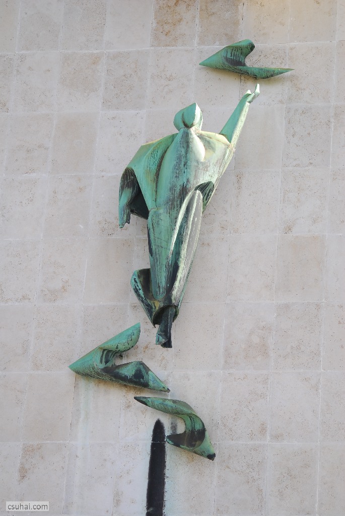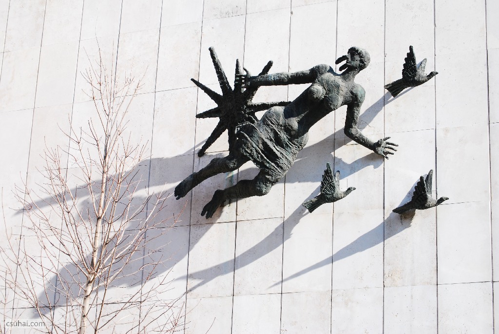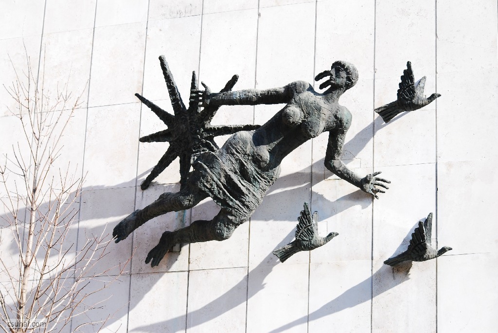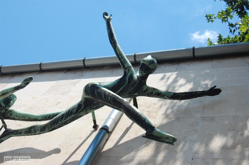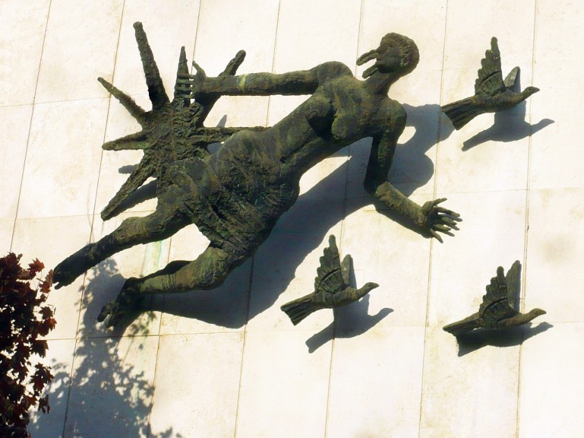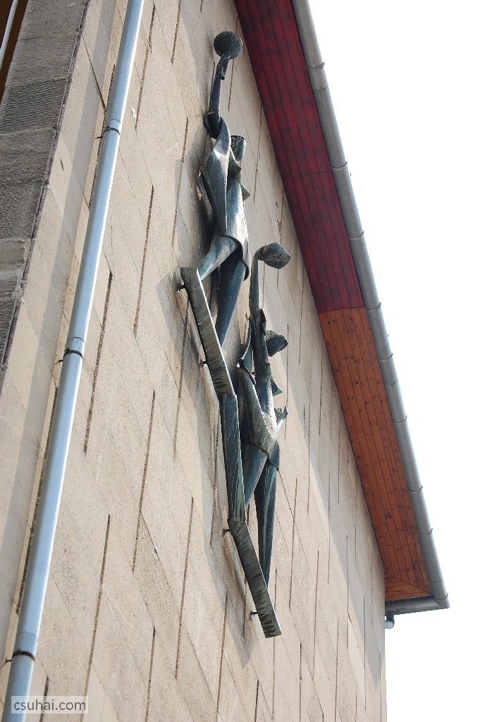 De ezen a helyen nem a végső érv helyzetében van a mondás, hanem a kezdetében, a cím az, és ezt a hevenyészett, tudománytalan nyelvészeti fejtegetést azért iktattam ide a cím kapcsán, mert a posztban a nyelvről, a jelentés átváltozásáról lesz szó. A címadással nyomatékosítani akartam, hogy olyan műfaj következik megint, amely mára kihalt már: a nagy homlokzati falfelületre illesztett, nagy méretű, figurális, háromdimenziós, teljes értékű fali szobor (a kihalást illetően mindegyik jelzőnek jelentősége van, mert ilyen vagy olyan kivételek mindig akadnak), öt példában, az időben visszafelé haladva elbeszélve (ezek közül az utolsót hónapokkal a poszt közreadása után illesztettem legkorábbi köztéri alkotásként a szöveg végére, látni fogjuk majd, miért). Mindegyikük kiemelkedő szobrászati teljesítmény, a korszak vezető szobrászaitól, olyasmi, ami az 1960-as években kifejezetten nagy divatját élte Magyarországon, de az idők múltával mondhatni eltűnt a köztéri szobrászatból. És azt még viccből, iróniával vagy eltúlzással se mondanám, hogy “lelépett a falvédőről”.
