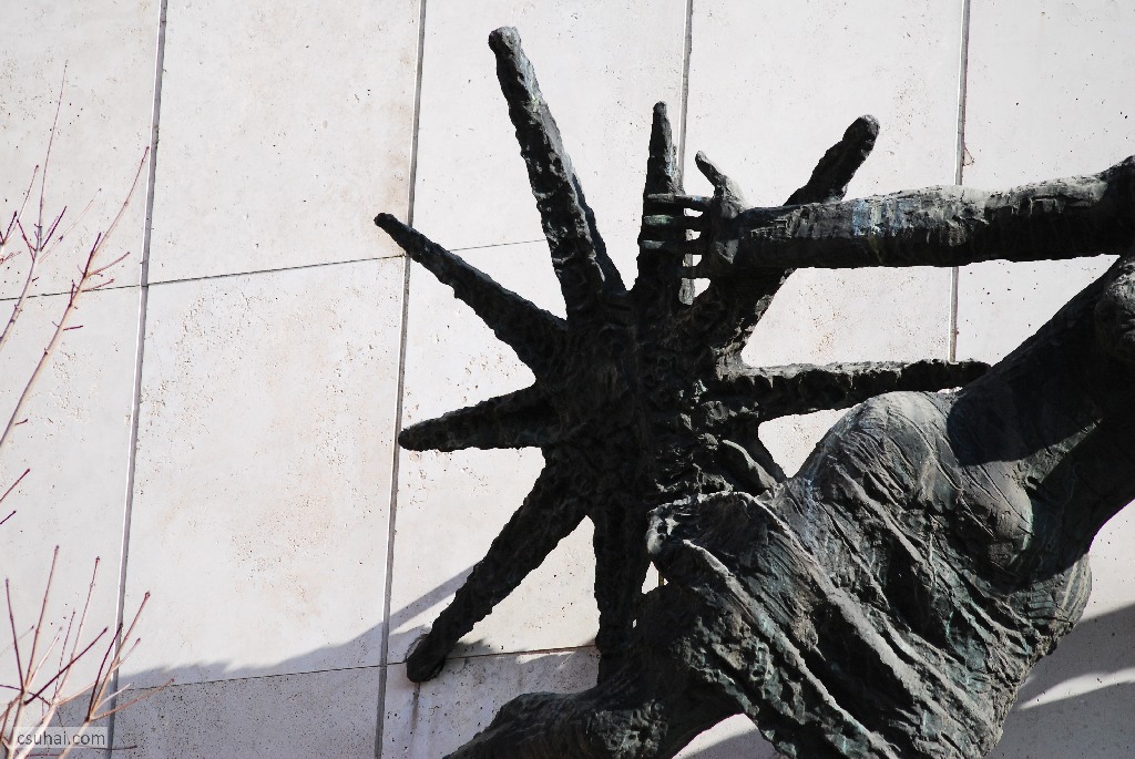 akár kicsit tompábban, színesebben a nyári ragyogásban, a mellette álló fa leveleitől övezve. Nem találtam rá sehol utalást, de az avatási dátumból, a felhelyezést mutató Fortepan-kép hófoltjairól gyanítom, hogy ez (ahogy az egész épület) annak idején évfordulós dolog lehetett, mint minden ekkora méretű 1969-es állami beruházás, alkalom a Tanácsköztársaság ötvenedik évfordulójának a megünneplésére. A szobron erre még sincs semmilyen, ma szembetűnő konkrét ikonográfiai utalás — a szobor a helyén maradhatott, mert olyan nyelven íródott (a blogon bemutatott sok szoborhoz hasonlóan), ami képes megszólítani, vagy ha az kell, éppen békén hagyni minket is.