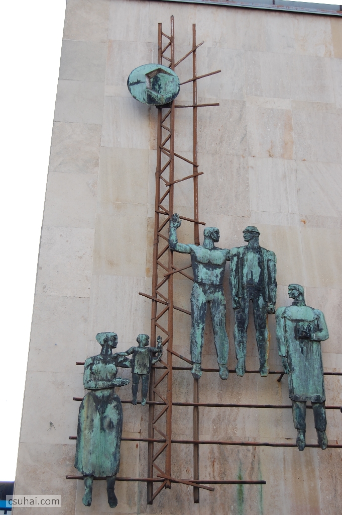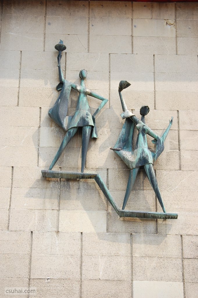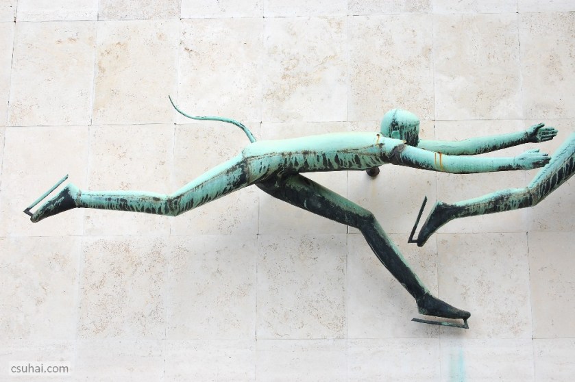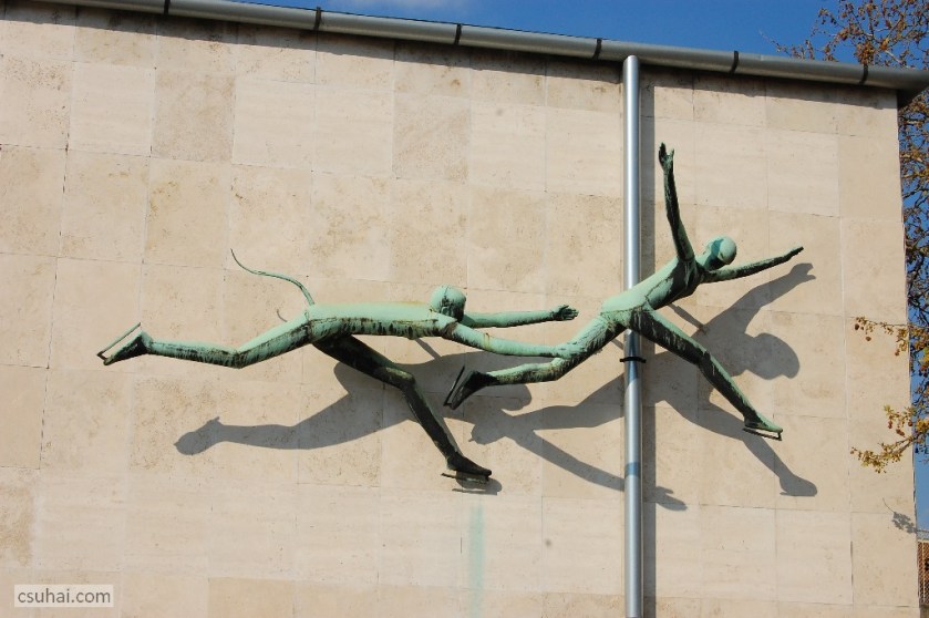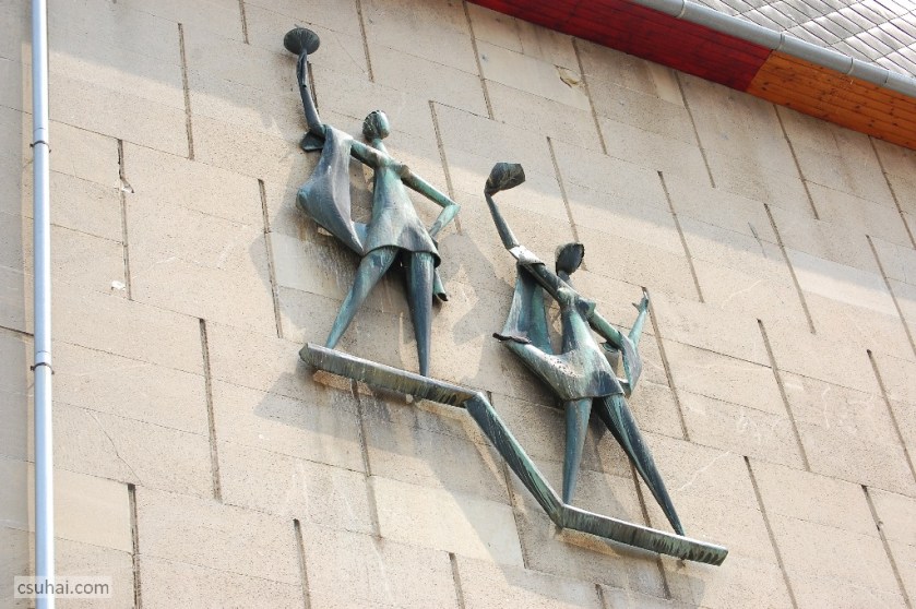 Korcsolyázók című falszobrát. Itt teszem hozzá, hogy ahogy az 1969-es szobrok nagy része 1919. március 21-hez, úgy az 1965-ös szobrok döntő többsége 1945. április 4-hez, a felszabadulás huszadik évfordulójához kötődik, vagy legalábbis ennek az alkalomnak köszönheti a létét; a Jégcsarnok befejezése és átadása is alighanem ilyen jubileumi ünneplés volt annak idején.