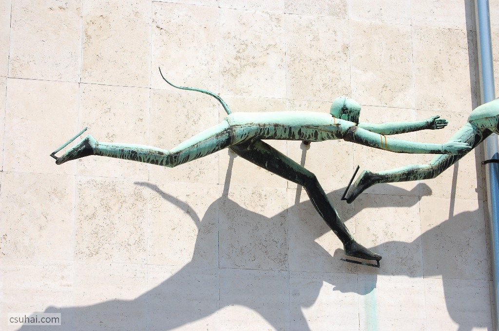 A Korcsolyázók (amit jól láthatóan még a fentebbi Dózsa-Farkas András falszobor bajánál is jobban sújt az ereszcsatorna) aztán sok mindennel megvádolható, ideológiai kötődéssel igazán nem. A kis ördögfarok (melyről részleteket, titkának egyik megfejtését alul, a Köztérképes szoborlinken lehet olvasni) elég iróniát csempész bele a szoborba, hogy ne vegyük egy-az-egyben komolyan. Egyébként is a korszak egyik fekete bárányának számító Szebényi Imre (1923–1983) munkája, aki az 1950-es évek elején az Iparművészeti Főiskolán Somogyi József, majd a Képzőművészeti Főiskolán Mikus Sándor és Szabó Iván tanítványa volt, de a diplomáját végül nem szerezte meg, épületszobrászati munkákból tartotta el magát, 1968-ban pedig végleg elhagyta Magyarországot. Kanadába disszidált, hogy a kor szóhasználatát alkalmazzam, odakint pedig nem kísérte pályáját komoly siker; távozásának megfelelően ez a falszobor a kevés felállított Szebényi-szobor egyikeként ritkaságszámba megy.