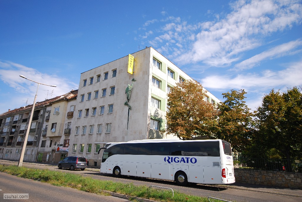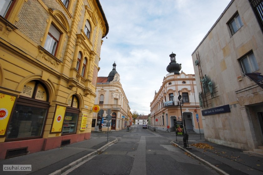 A pápai belvárosban, a Kossuth Lajos és a Deák Ferenc utcák kereszteződésében, a fenti képen jobbra látható a környezetéből meglehetősen kilógó, a másik három sarok tizenkilencedik századi építményeitől eltérő épület (a képen épp szemben lévő két ház, közülük a jobbra eső a pápai főposta, ráadásul saroktornyos).