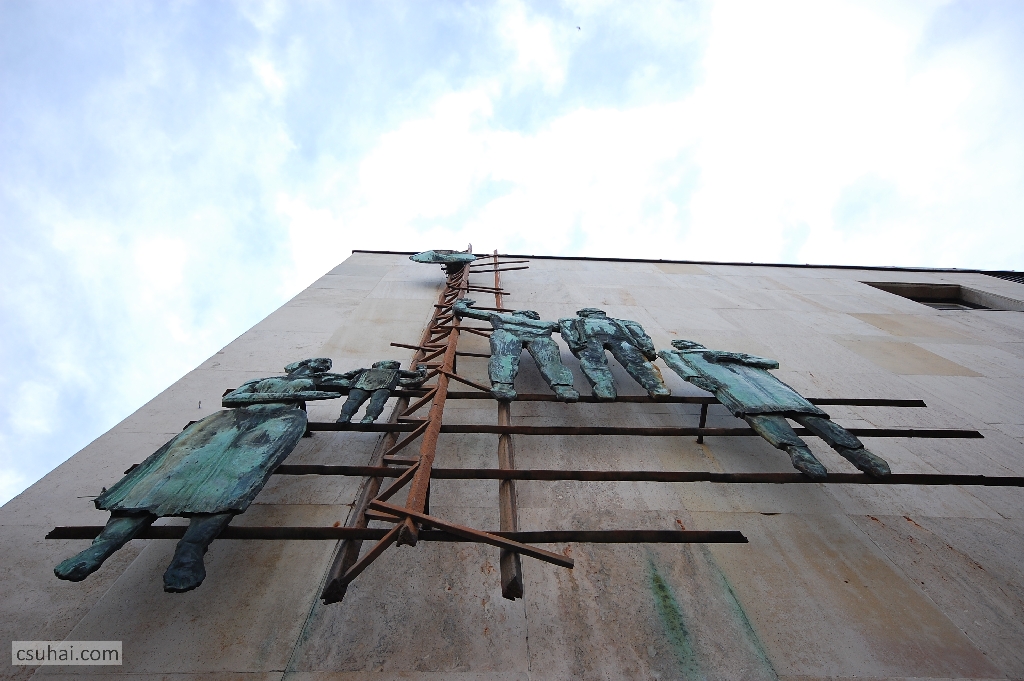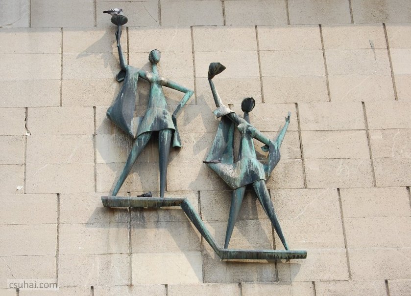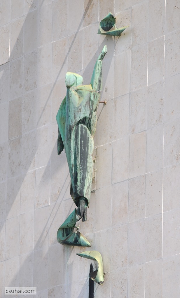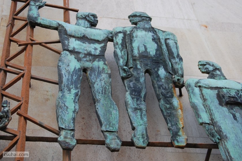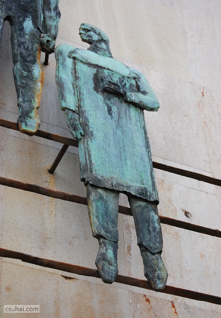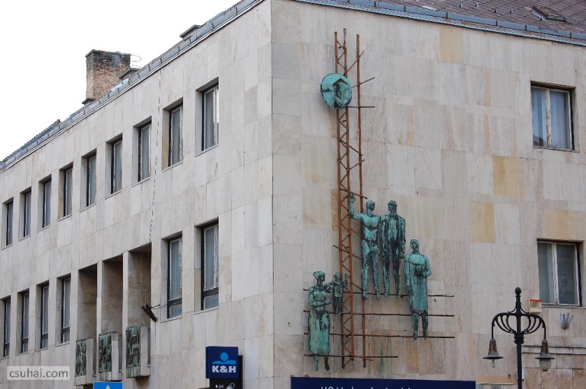 Az olvasó ellenvetheti persze, hogy Kiss fali szobra a posztban bemutatott többi fali művel ellentétben kétdimenziós, nem szoborra, hanem domborműre vagy reliefre hajazó műalkotás, ám épp az alapját képező vastraverz, mely statikai funkcióján túl az építés, az építkezés, a daru, az állványzat képét is hozzátette az ábrázolt jelenethez, sajátos módon eloldotta és kimozdította a szobrot — a valóban lapos, rajzszerű, figyelmesen nézve nem háromdimenziós figurákhoz végül mégiscsak hozzáadta a harmadik dimenziót.
