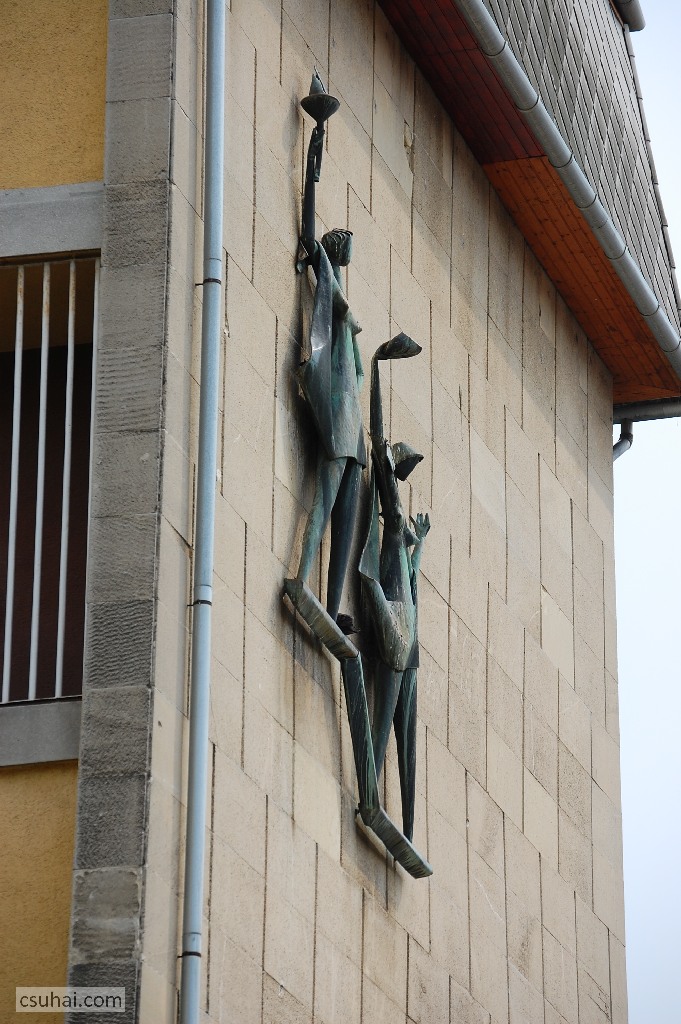 Hónapokkal e bejegyzés közreadása után, régebbi bakonyi képeim közt keresgélve jutott eszembe, hogy még egy fali plasztika tartozik ebbe a sorba, időben rögtön az elejére, vagyis e hátrafelé haladó szöveg végére; a körülmények miatt, látni fogjuk, amúgy sem tudok már neki külön posztot írni.