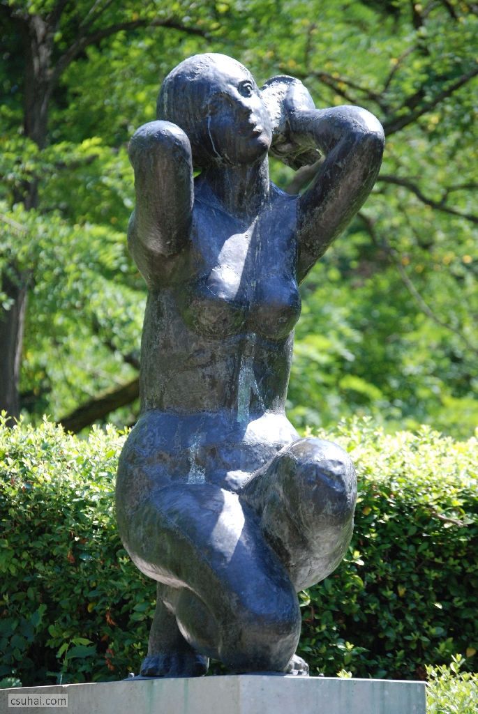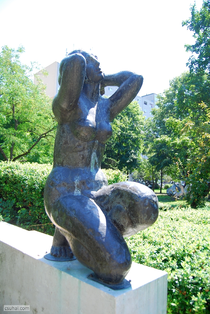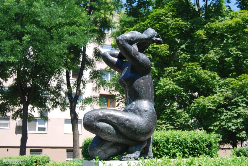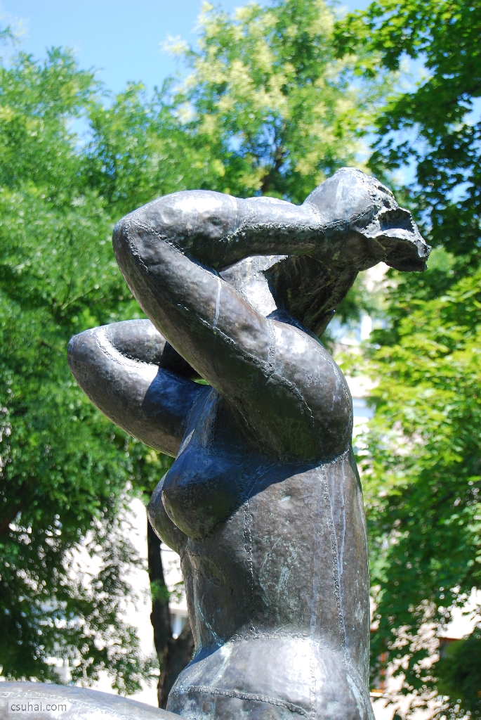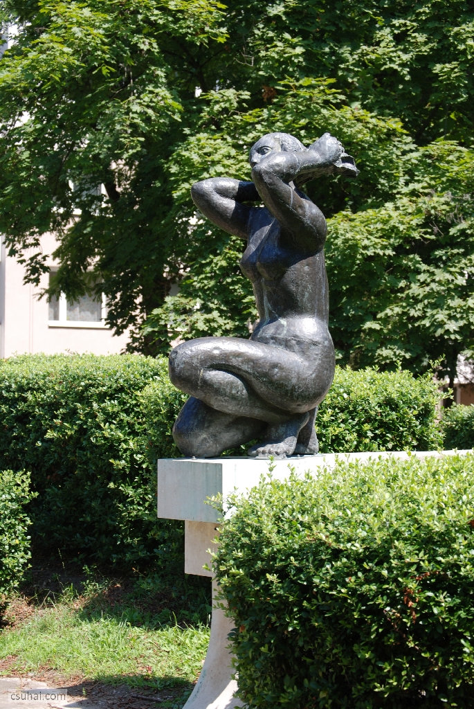 azonnal eszembe juttatta a tiszaújvárosi féltérdre ereszkedő Fésülködő nőt. Érv már volt — erre a testtartásra itt a blogban is, biztosan sokan emlékeznek a józsefvárosi díszkútra, Makrisz a pályája utolsó szakaszában felállított kompozíciójára, melynek legelső tervei az 1970-es évek közepéről valók,