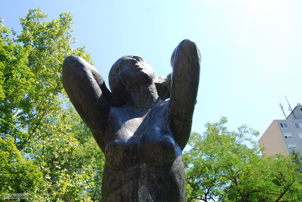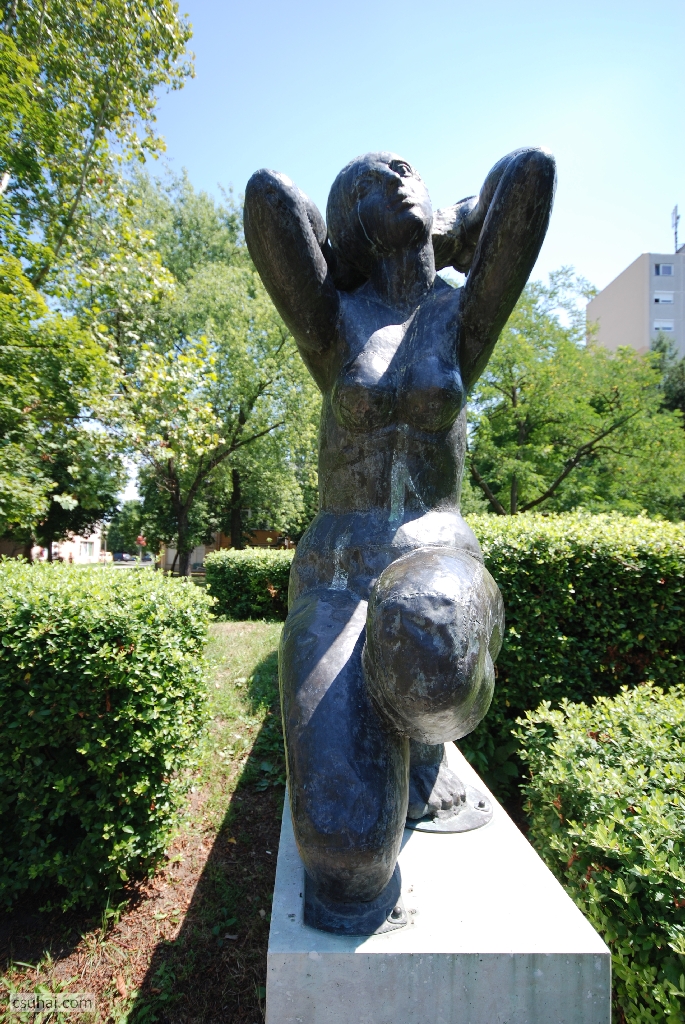 Tiszaújváros nekem az ígéret földje, nagyon úgy fest. Mióta tavaly nyáron, a Várady Sándor lányszobráról szóló bejegyzésemben megígértem további szobrokat a városból, Ungvári Lajos Napozó nője után ez a most következő Makrisz-szobor, a Fésülködő nő már a második beteljesülő tiszaújvárosi ígéretem lesz. De talán nem kötök az olvasó orrára súlyos műhelytitkot, ha bevallom, hogy ez az első látásra hagyományos, figyelmesebben nézve azonban egyre határozottabban modernizálónak tűnő figurális szobor