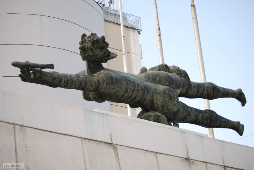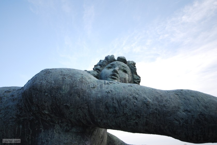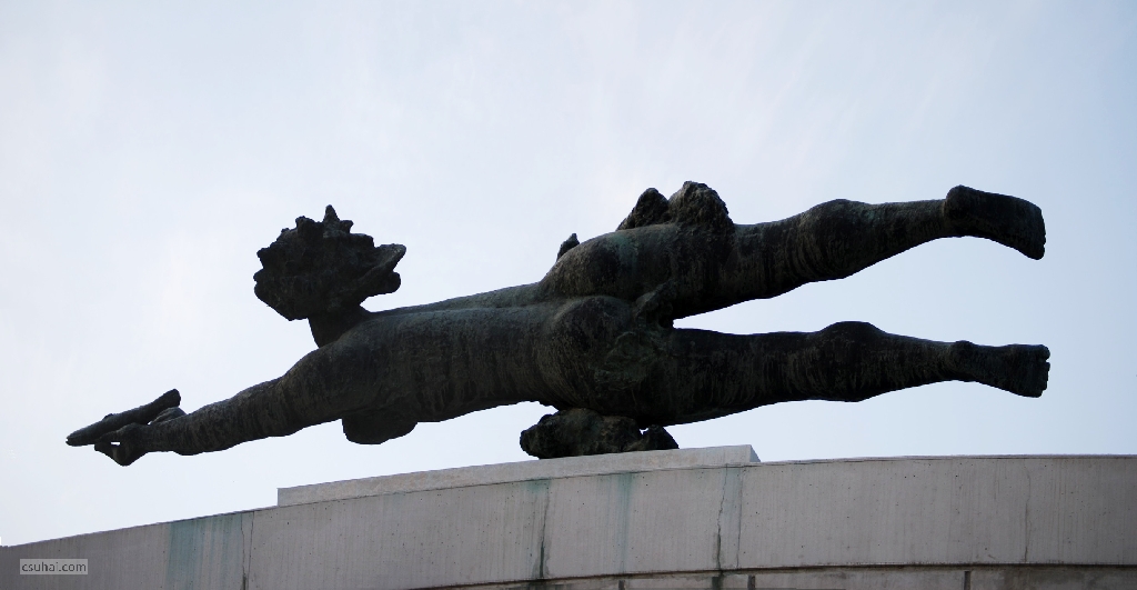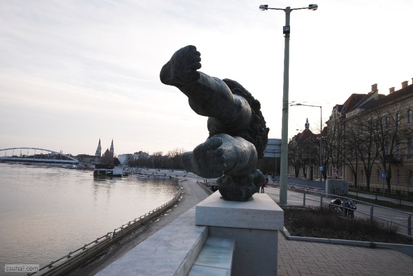 Ha nem lenne több képem, akkor sem kéne sokáig bizonygatnom, hogy ez a szobor a közelmúltban felújított szegedi partfal tetején igen jó helyen van, a graffittitól most eltekintve szűkebb környezetének geometrikus vonalai szépen kiemelik achitekturális trükkjét, a hatalmas tömegű szobor egyetlen ponton alátámasztott egyensúlyát.
