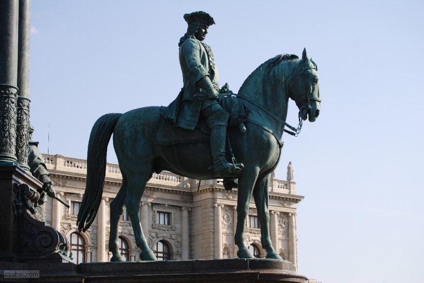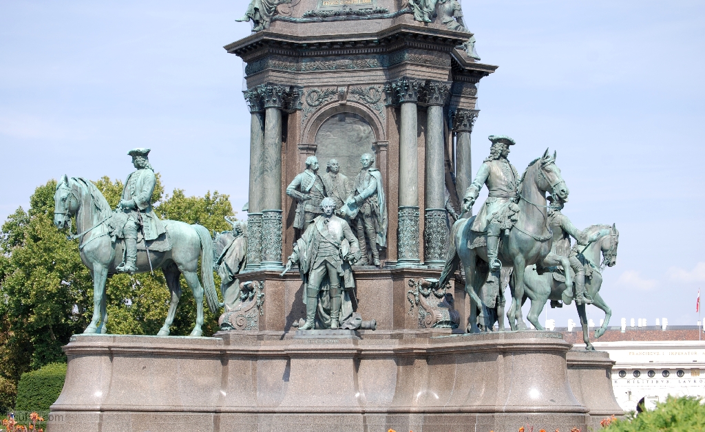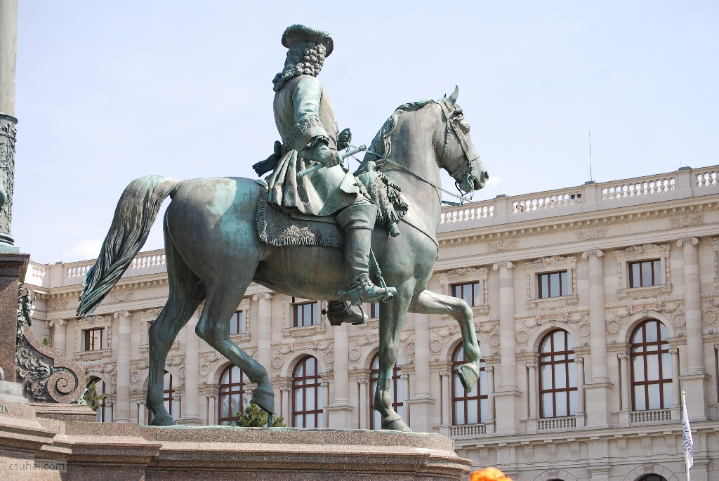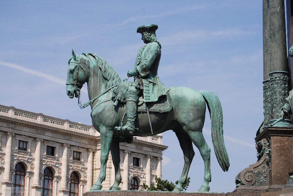 végképp elszabadultam, és már lubickoltam a dologban, mint gyermek az IKEÁ-ban, ha ezerhatszáz egyforma plüsstigris közé keveredik. Sorra kifényképeztem hát Mária Terézia kedves, lovon ülő, az emlékmű négy sarkában szimmetrikusan helyet foglaló tábornokait, Caspar von Zumbusch szobrait,