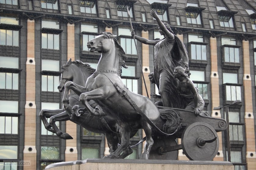 A történet 2015 őszén kezdődik, Londonban, a Westminster híd északi főjénél, a Parlamenttel átellenben lévő oldalon álló Boudica és leányai (Boadicea and Her Daughters) című szoborcsoporttal, a blogban már emlegetett két Thornycroft, az apa, Thomas (1815–1885) és a fiú, Hamo (1850–1925) több mint huszonöt éven át közösen készített munkájával, a Római Birodalomnak ellenálló kelta királynőnek és lányainak emléket állító szoborral; a címet adó hős szereplők két ágaskodó ló vontatta harci szekéren száguldanak a Westminster Palota irányába. A szobrot elkészülte után majd húsz évvel, 1902-ben állították fel mostani helyén, és ez a hely (talán a XX. század elején ez még nem volt így) a XXI. századra meglehetősen zavaros lett.
