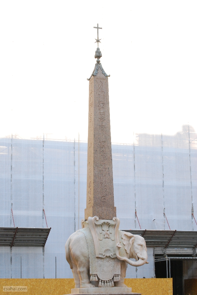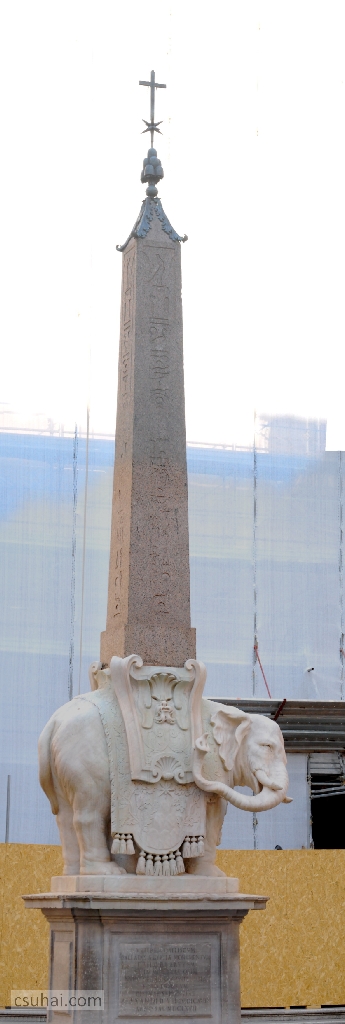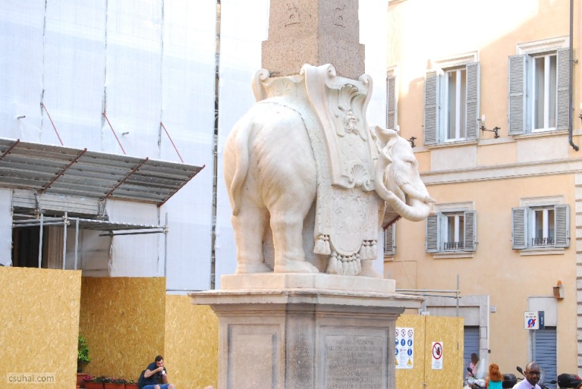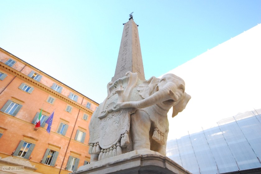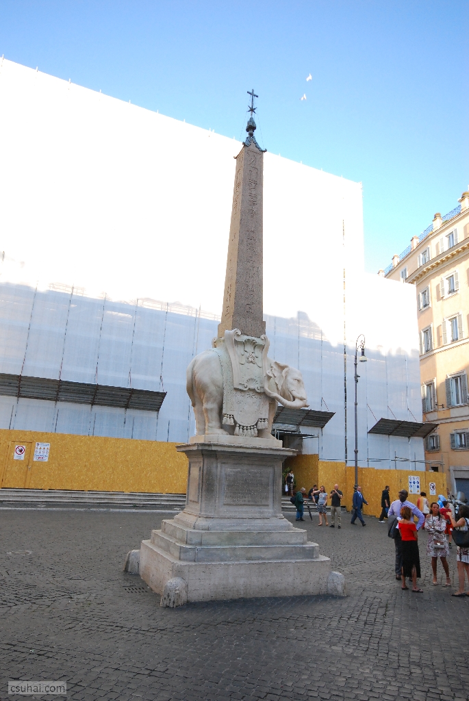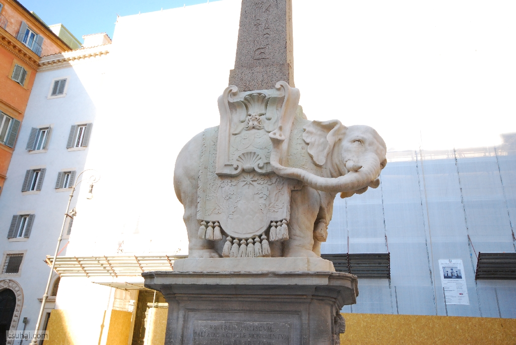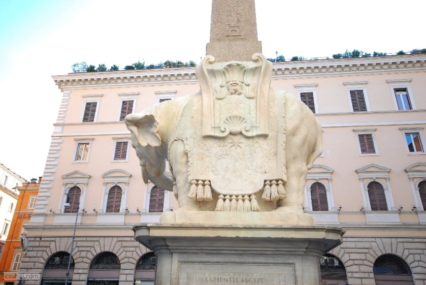 az elefánt a hátán pedig ott egyensúlyozza a tizenhárom Róma-szerte álló, egyiptomi eredetű obeliszk egyikét,