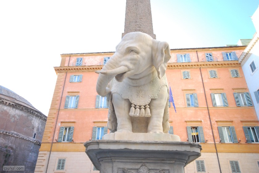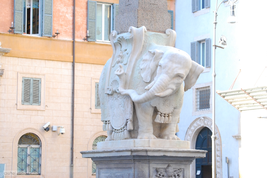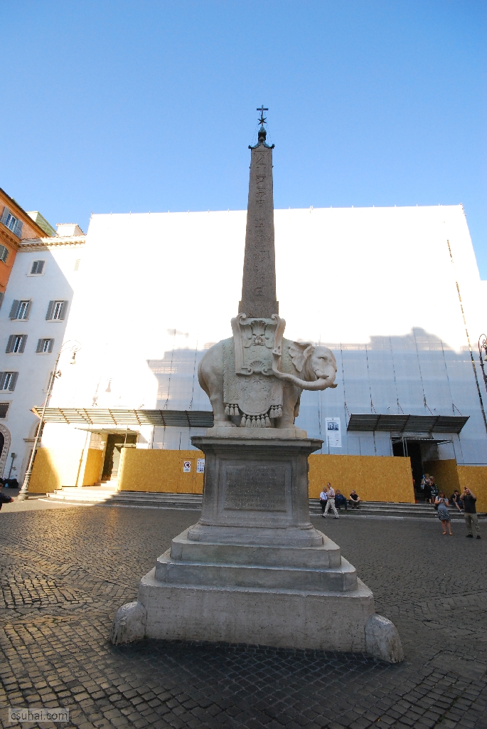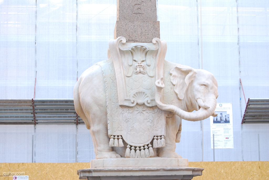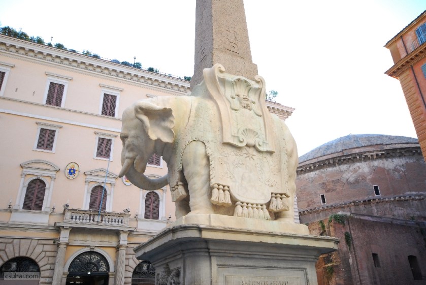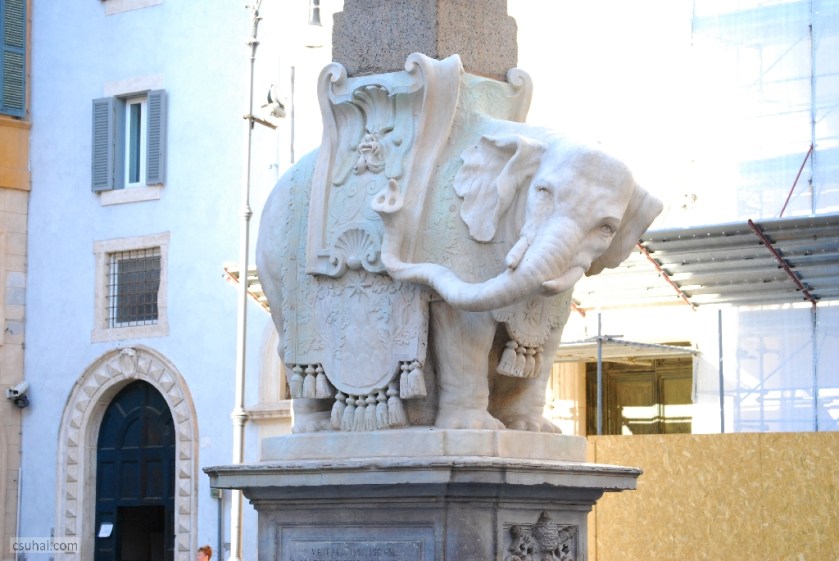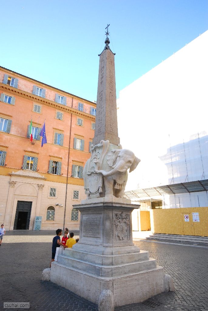 az elefánt a hátán pedig ott egyensúlyozza a tizenhárom Róma-szerte álló, egyiptomi eredetű obeliszk egyikét,