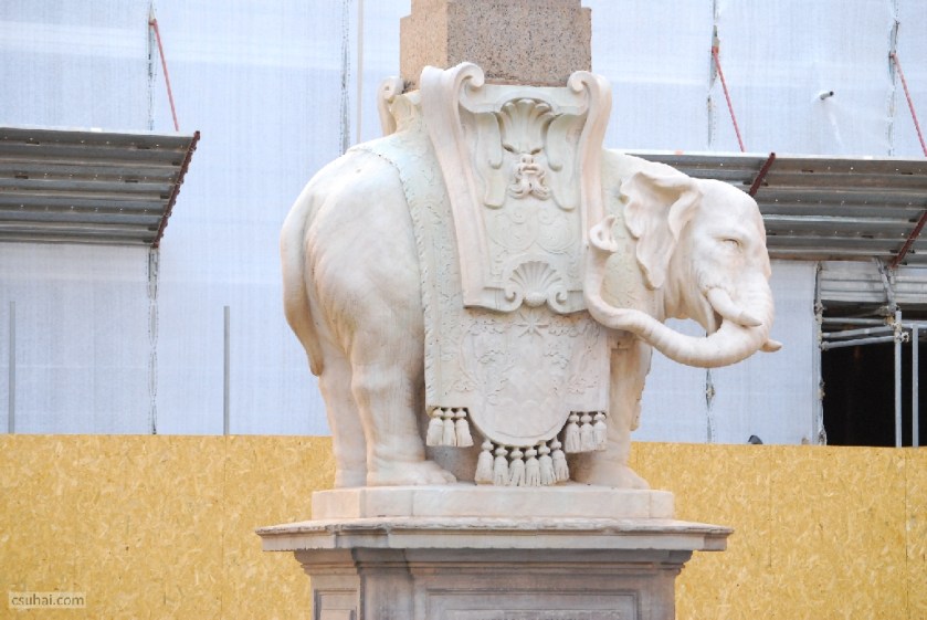 Az obeliszk újkori csúcsdíszének ikonográfiájáról (a Rómát jelképező dombokról, a pápai csillagról és a keresztről) majd egyszer máskor. Most jöjjön az elefánt,
