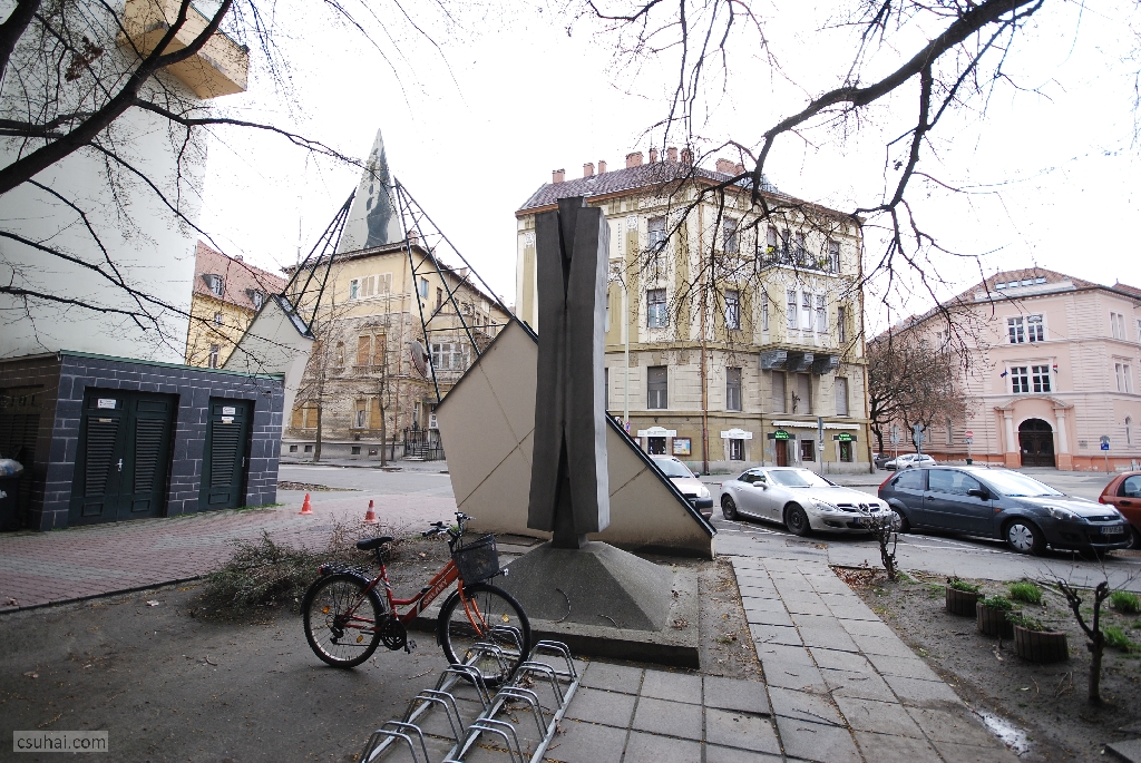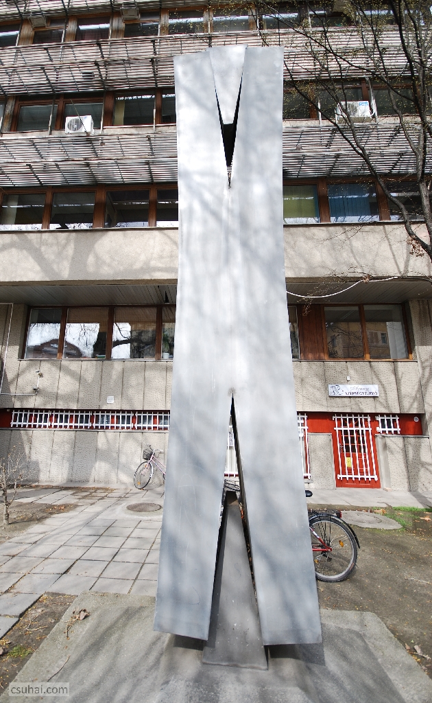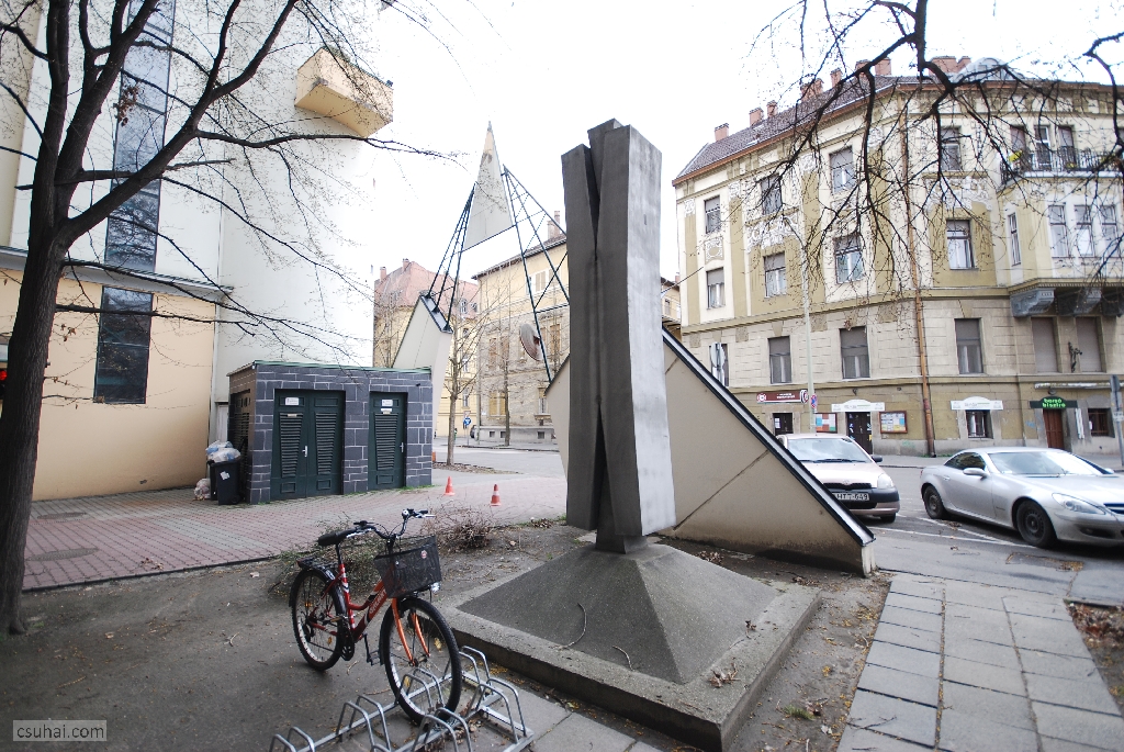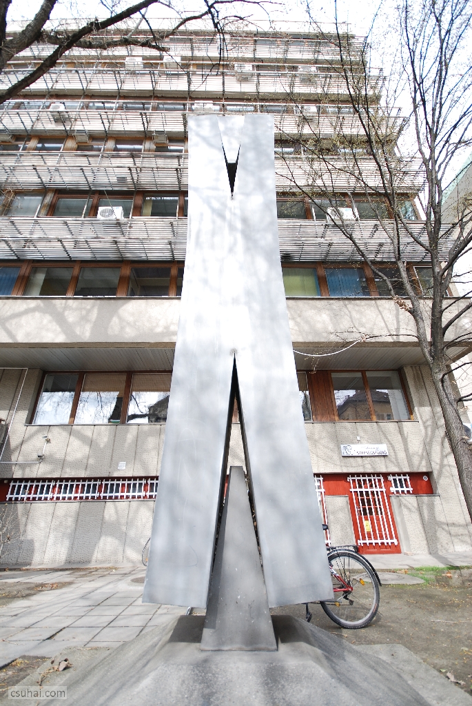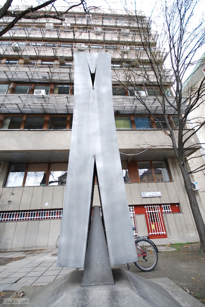 mit is akarok részletezni. A korábbiakkal ellentétben most nem figurális szoborról van szó, illetve hát rögtön ez a definíció feladja a leckét. Ha ugyanis hozzászámítjuk a látványhoz, hogy a négy és fél méteres, a látszattal ellentétben nem betonból vagy műkőből, hanem alumíniumszórásos felületkezeléssel krómacélból készült műtárgy 1975-ben a Csongrád Megyei Építőipari Vállalat akkoriban felépült szegedi belvárosi irodaháza elé került,