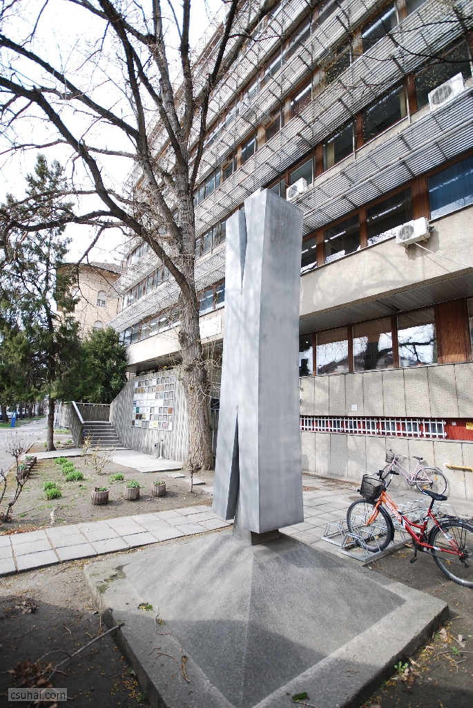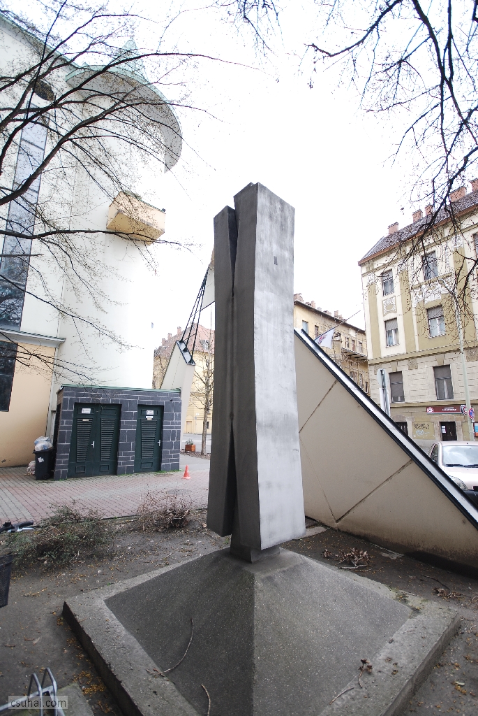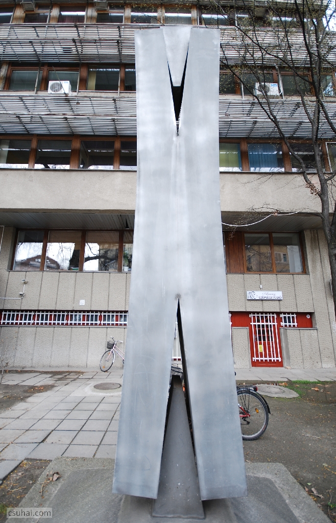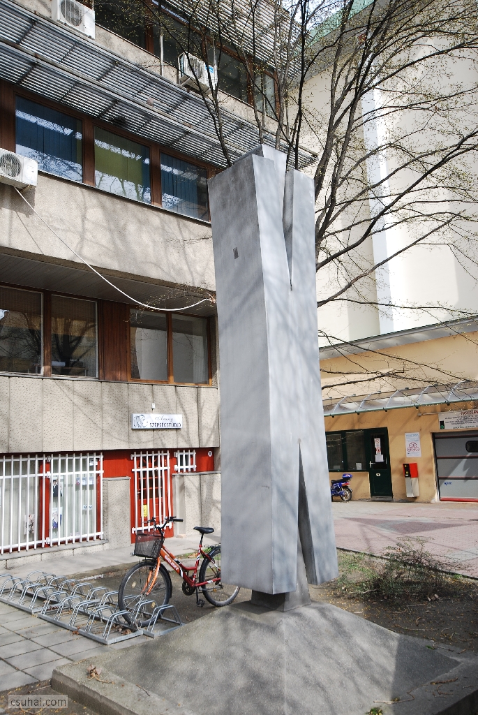 mit is akarok részletezni. A korábbiakkal ellentétben most nem figurális szoborról van szó, illetve hát rögtön ez a definíció feladja a leckét. Ha ugyanis hozzászámítjuk a látványhoz, hogy a négy és fél méteres, a látszattal ellentétben nem betonból vagy műkőből, hanem alumíniumszórásos felületkezeléssel krómacélból készült műtárgy 1975-ben a Csongrád Megyei Építőipari Vállalat akkoriban felépült szegedi belvárosi irodaháza elé került,