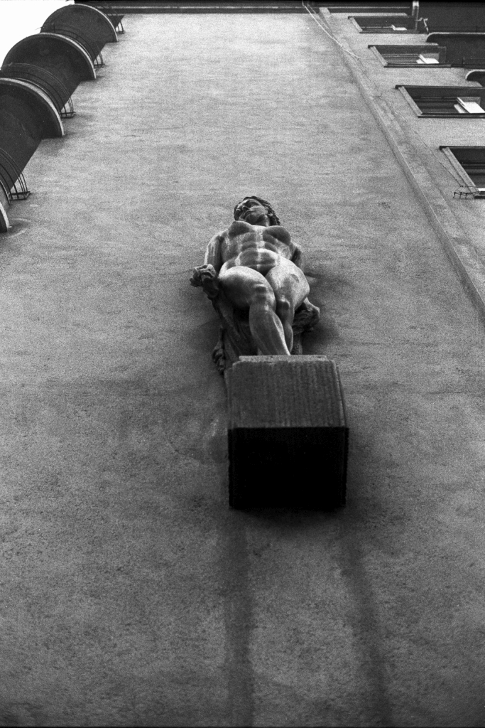 és ez még akkor is így van, ha a szobor éppen az elsüllyesztéssel, az elsüllyedéssel expressis verbis saját, falon való elhelyezését tematizálja — mint ez az egyelőre előttem még azonosítatlan szerzőjű szobor az amszterdami Wanrooij Gallery homlokzati falán.