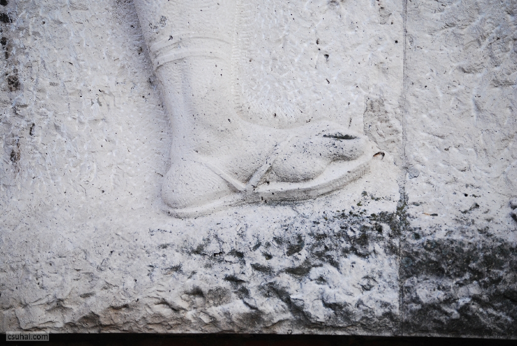 bár éppen ez, a három, kétoldalt egy-egy szélesebb, középen egyetlen keskeny táblából összerakott kő dombormű egyik metszésére eső saru igen szép darab — eluntam magam, és fényképezési taktikát változtattam.