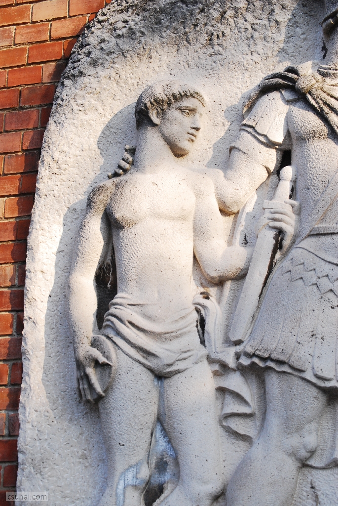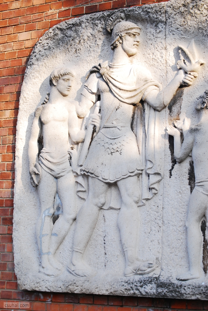 Madarassy Walter A katona hazatér családjához című, a téglafalas általános iskola Vihar utcai bejárata mellett elhelyezett domborműve (noha a szerzői mesterjegy és évszám szerint 1961-es műről van szó) azonban nem különösebben nyert meg magának. Nyilván Aquincum közelsége inspirálta és indokolta a domborművet,