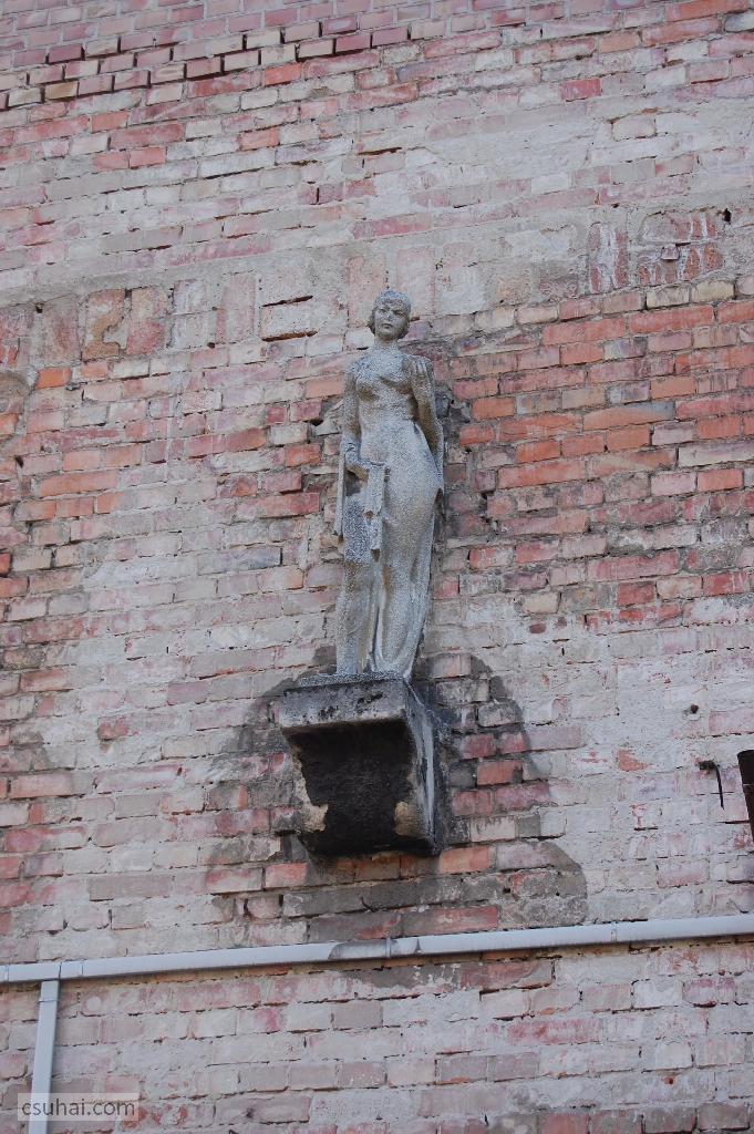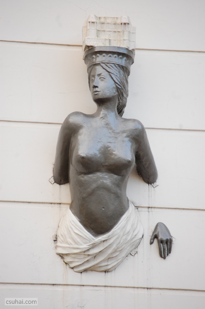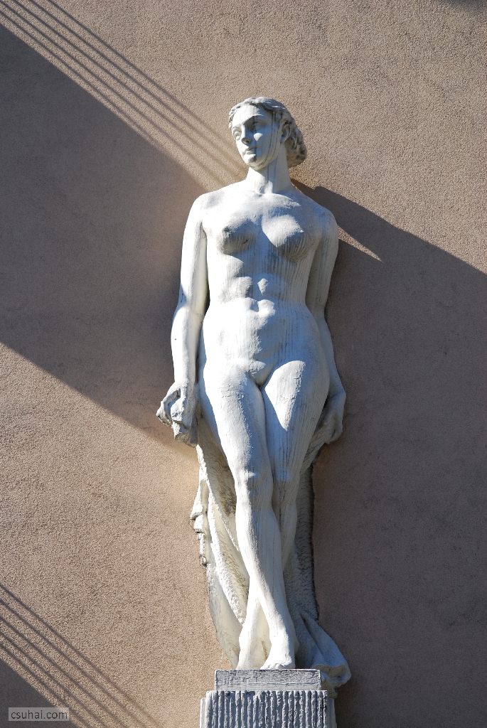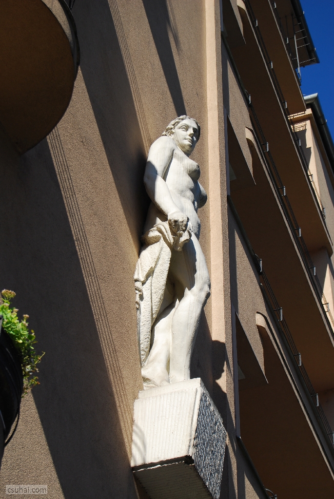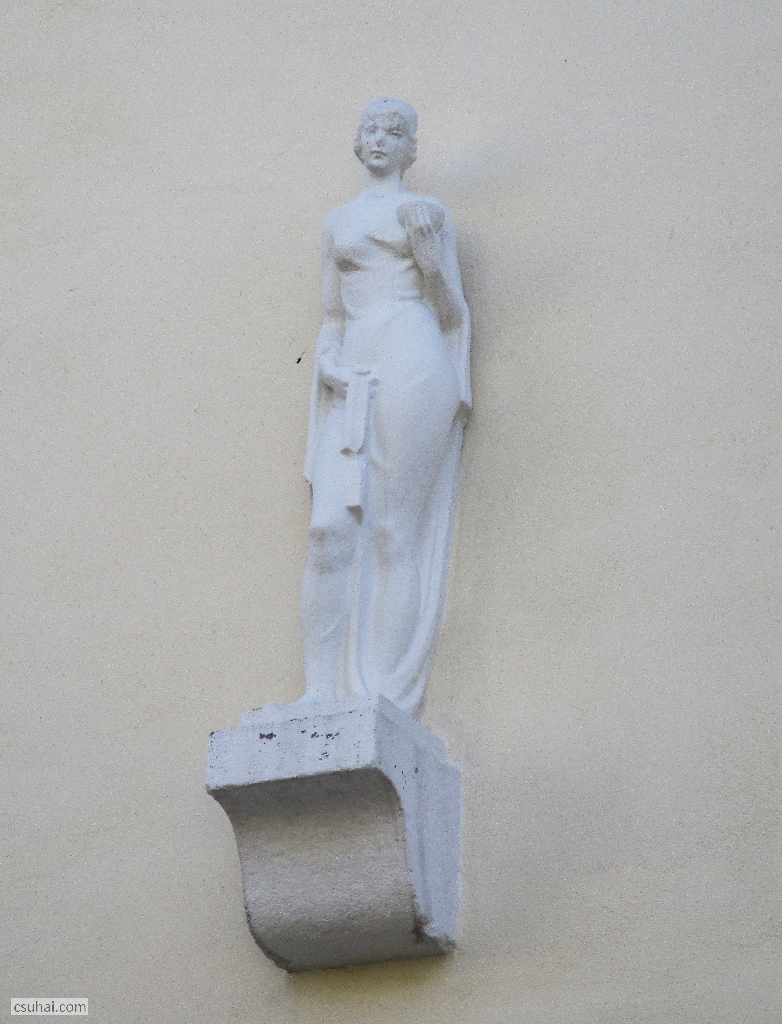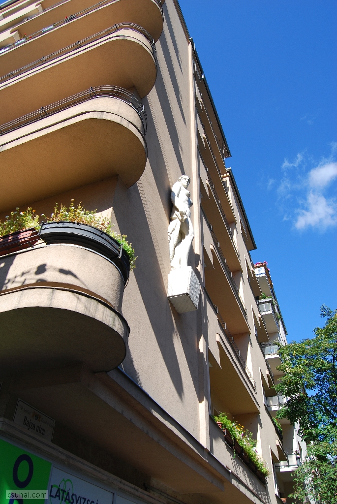 Van egy szeretett épületdíszítő szobrom az Erzsébetvárosban, a Bajza utca–Damjanich utca sarkán álló modern, az 1930-as évek közepe táján emelt minőségi lakóépület Bajza utca felé eső frontján, a második emelet magasságában.