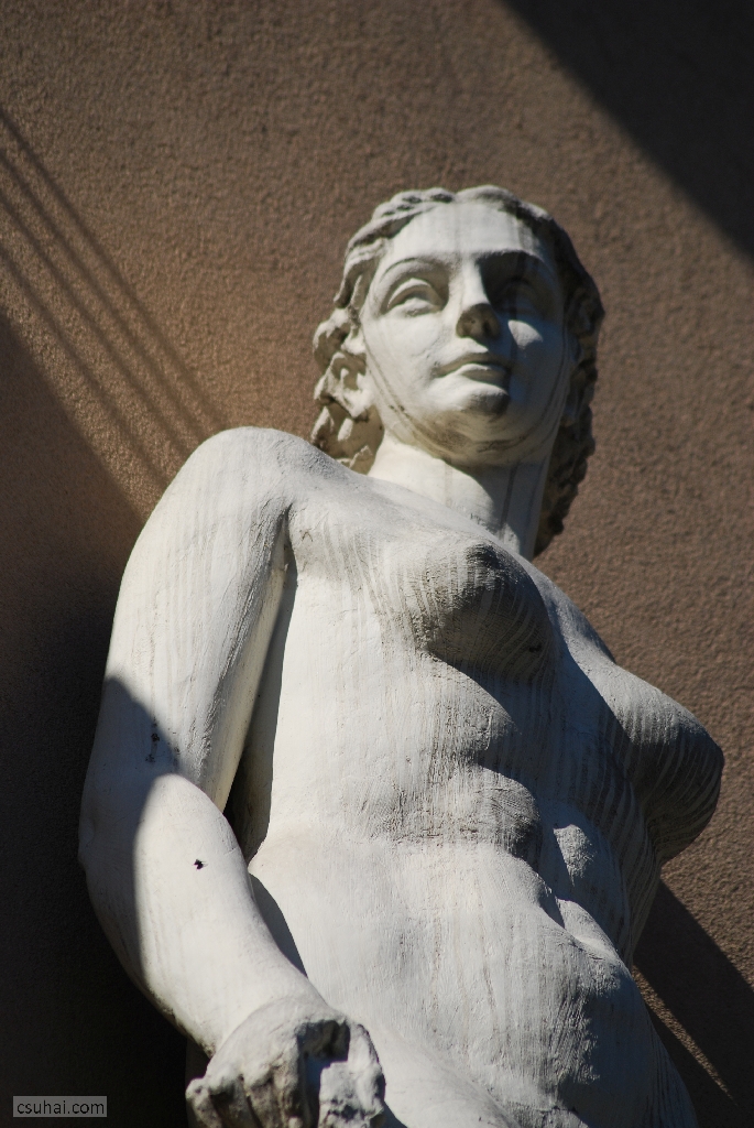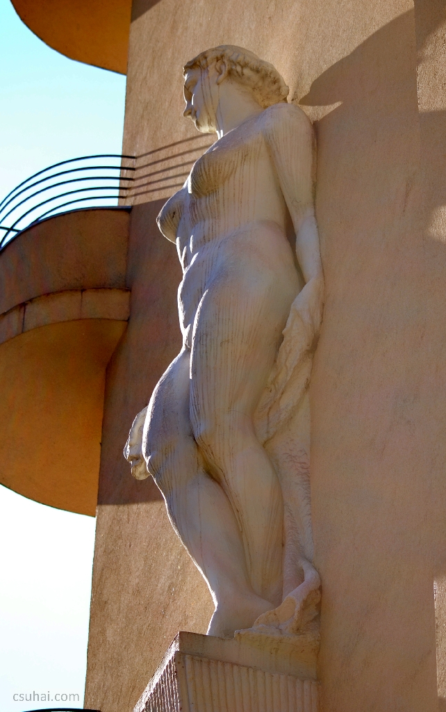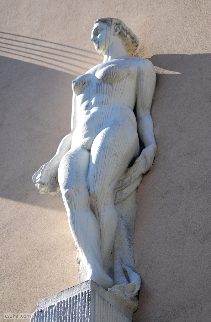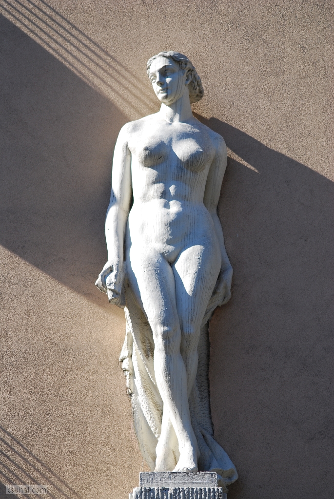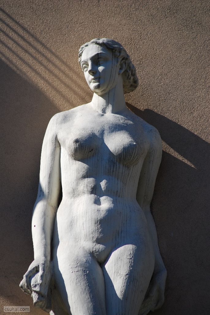 Azt hittem, ezerszer lefényképeztem már, de nem, 2017 szeptemberében egy verőfényes őszi napon külön el kellett zarándokolnom hozzá. Ebben még nincs semmi különös, ilyen jellegű díszítőszobor, akár még akt is, mindkét nemből számtalan akad Budapest-szerte, és aki ismer engem (és még nem is kell szeretnie), tudja, sokhoz elzarándokoltam már. Ez a szobor ráadásul nem első helyen jegyzett szobrász műve, a ház felépültekor elhelyezett ornamentális figurát Szentgyörgyi Darabos János készítette, akinek a Köztérkép kiterjedt adatbázisa ezen kívül két munkájáról tud.