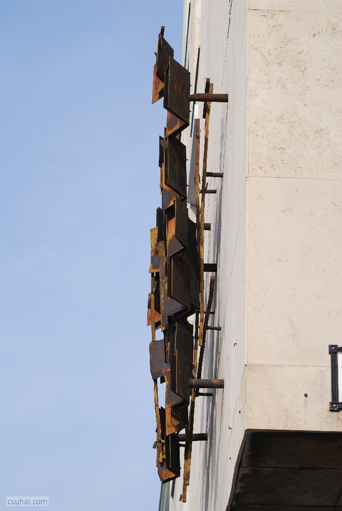 és ez még akkor is így van, ha a szobor éppen az elsüllyesztéssel, az elsüllyedéssel expressis verbis saját, falon való elhelyezését tematizálja — mint ez az egyelőre előttem még azonosítatlan szerzőjű szobor az amszterdami Wanrooij Gallery homlokzati falán.