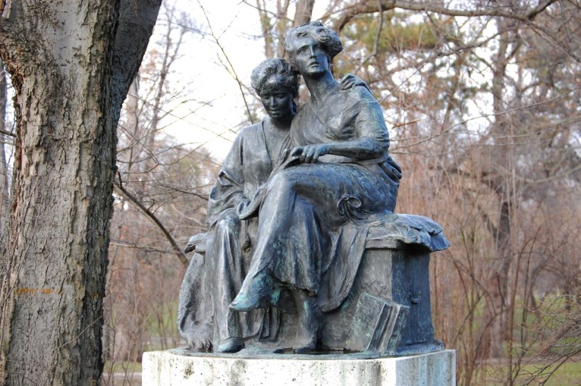 mert ez a két fiatal nő (a főalakhoz hasonló bronz anyagával; a magasabbnak, a jobb oldalon ülőnek volt Strobl lánya a modellje), ha mellékalak, kitűnő és speciális példa lett volna ebben a talapzatokon elhelyezett erős nőkkel foglalkozó bejegyzésben, éppen azért, mert nem valamilyen elvonatkoztatott attribútumot, a dicsőséget, a becsvágyat, a történelem hübriszét, a hazát, hanem egy író számára nagyon is alapvető fontosságú profán tevékenységet, az olvasást jelenítették volna meg.