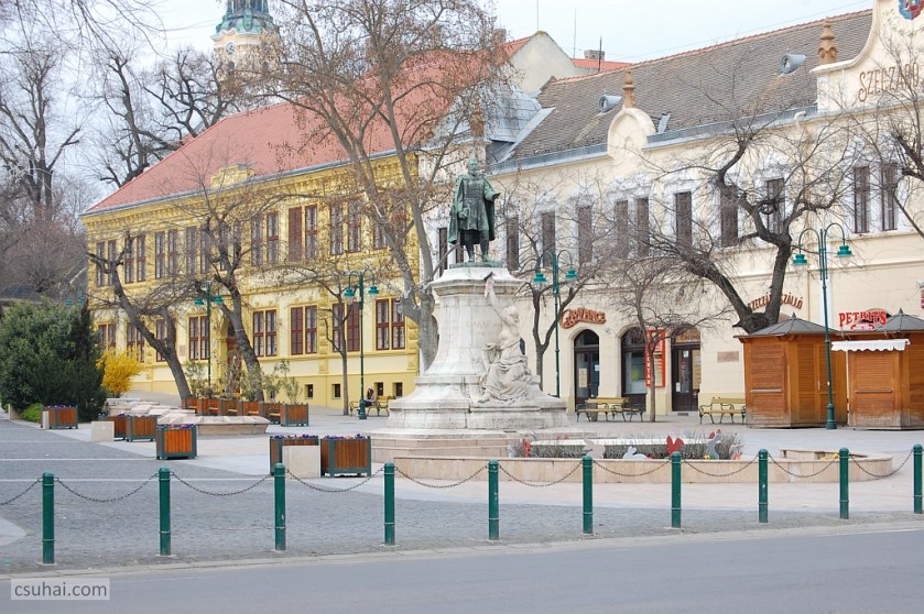 decensen felöltözve árválkodik a Gerster Kálmán által a csupán az egyalakos szoborhoz tervezett piedesztálon.