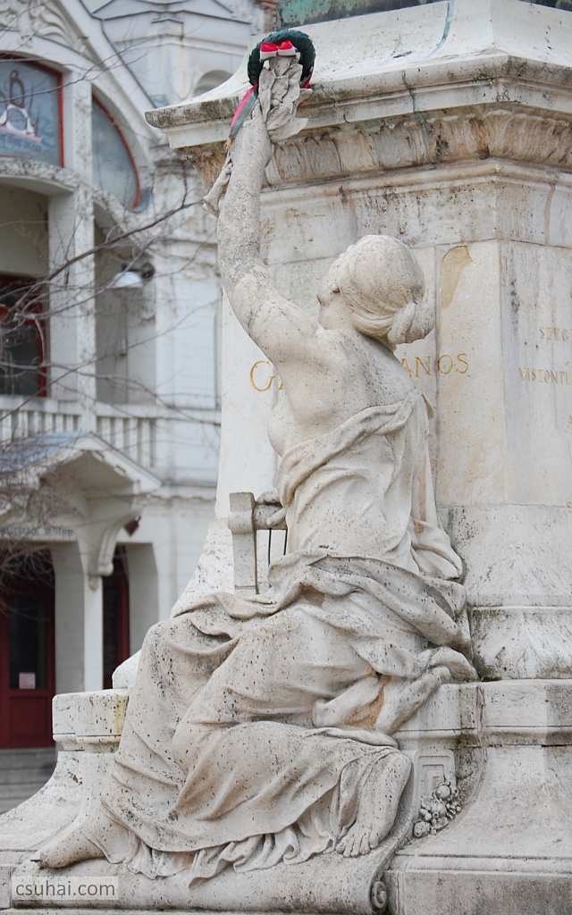 és a szobor ugyanazzal a megoldással él, mint az eddig bemutatottak: felül, a magasra meredő oszlop tetején a férfi főhős, lent, a talapzat alján, ezúttal ülő testtartásban az allegorikus nőalak.