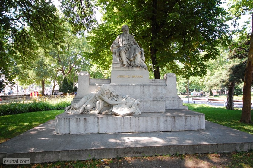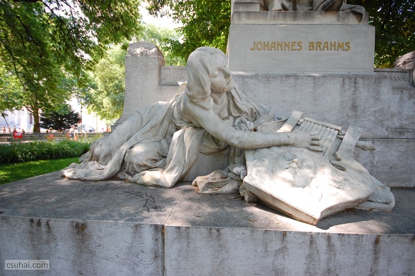 Rudolf Weyr 1908-ban, az akkor tizenegy éve halott zeneszerző 75. születésnapja alkalmából (akár még meg is élhette volna, szúrhatnánk közbe naivan) a bécsi Ringen, a Károly tér közelében felállított Brahms-emlékműve, amin azt kell érteni, az elmúlt években valahányszor ez az összeállítás, a piedesztálra emelt hős és a kíséretében helyet foglaló nő eszembe jutott, ez a kettős ötlött fel bennem.