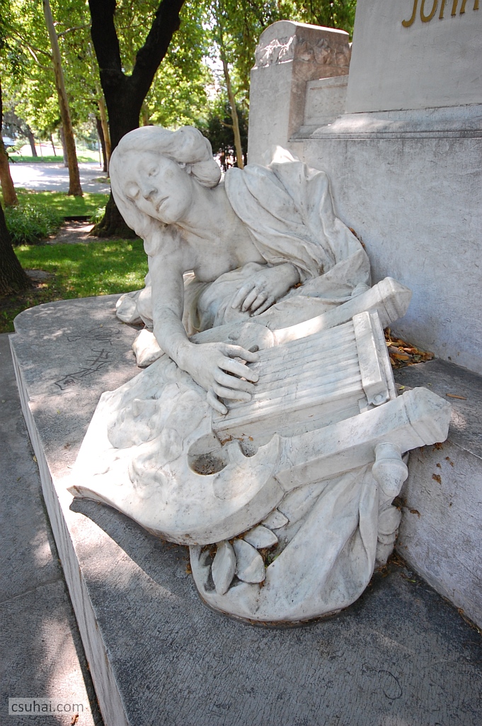 az élete virágjában depressziója elől fiatalon öngyilkosságba menekült Ferdinand Raimund (1790–1836) emlékművén, Franz Vogl 1898-ban állított munkáján az a bizonyos nő mentőangyal képében fönt áll, a főhős fölött, úgy reméljük, ki fogja húzni a hőst szerencsétlen sorsából; ám dehogy fogja. Rögtön hozzáteszem, a poszt a kihalt szoborműfajok egyre vastagodó katalógusát gyarapítja majd, nem is annyira a technikai megvalósítás tekintetében, mint ahogy megtörtént ez a kihalás a rácsdombormű vagy az ívzugszoborpár esetében, hiszen egy-az-egyben portrékat, akár teljes alakos szoborábrázolásokat híres férfiúkról-asszonyokról még mostanában is jócskán állítanak. De hogy a sikeres férfit és az odaadó nőt ilyen szájbarágósan összekapcsolják, alá- és fölérendeltségüket proxemikailag, ikonográfiailag így érzékeltessék, az most már jó néhány évtized óta ritka vagy éppenséggel lehetetlen. Szorosan ide tartozik, ezért itt mondom el, hogy a köztéri szobrászat és a funerális művészet közötti országúton az itt következő “műfaj” a többséggel ellentétes irányban halad — ez olyasmi, ami először a sírkertekben, síremlékeken lett divatossá és elfogadottá, és csak utána a köztéri szobrászatban; és az is tény, hogy manapság már sírokra sem állítanak ilyen megfogalmazású ornamentikát. De ami itt néhány példán át mindjárt látható lesz, mind a XIX. század végének ideáljához tartozik (még akkor is, ha egyik vagy másik szobor tényleges elkészülte alkalomadtán jócskán belelóg a XX. századba), amikor a fentebb említett mélyen romantikus elképzelés a hatalmas férfi és a gyengéd nő között még tartható volt. Ma ez az elképzelés, abszolút joggal, nem szalonképes. De azért nyugalom, minden valaki közelében ott áll valaki ma is.
