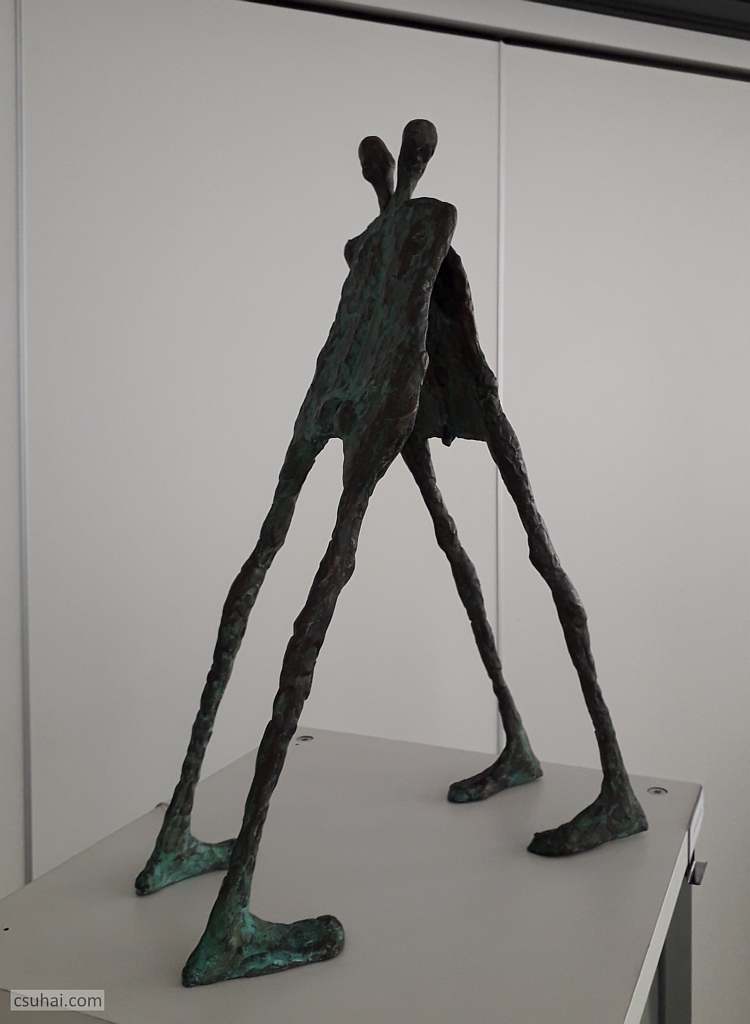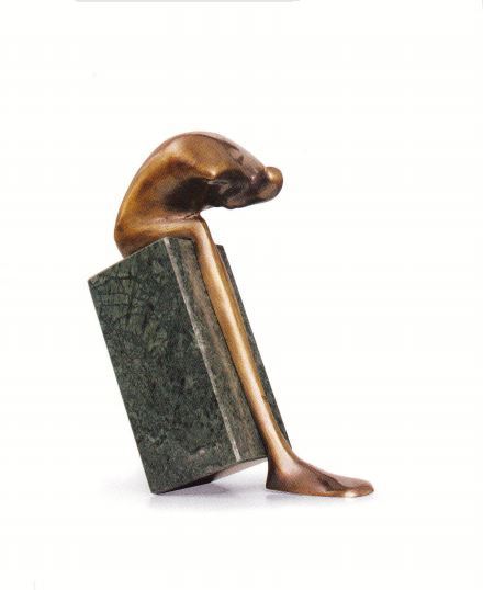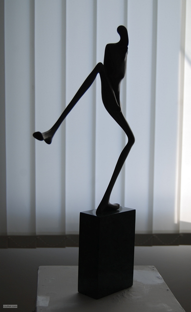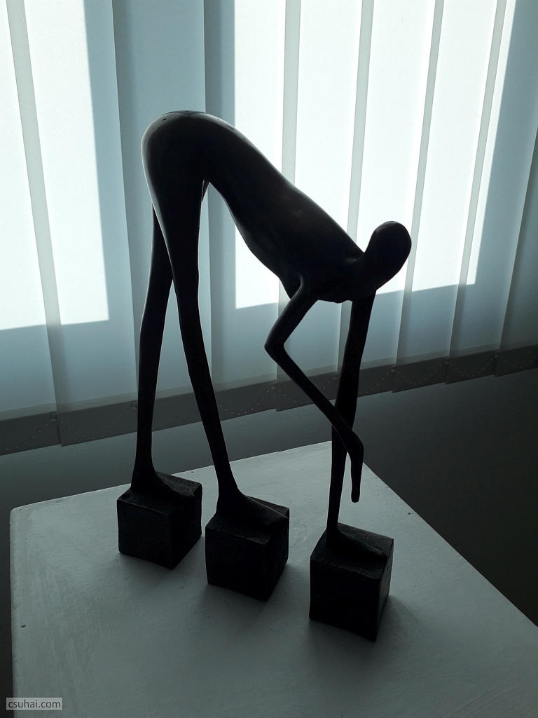 első pillantásra ülő meztelen férfi, és minél többet nézzük, annál inkább előtérbe kerül a deréktől megnyújtott két láb, az elfordított, kicsavart felsőtest (a két képemen nem látszik, hogy a figura milyen extrém mértékben dől a kis talapzat síkja mögé), az elnyújtott és vázlatszerűen megfogalmazatlanul vagy éppen karikatúraszerűen hagyott arc; mintha semmi nem lenne valóságos rajta egyenként, az egész együtt mégis nagyon ismerősen igazi.