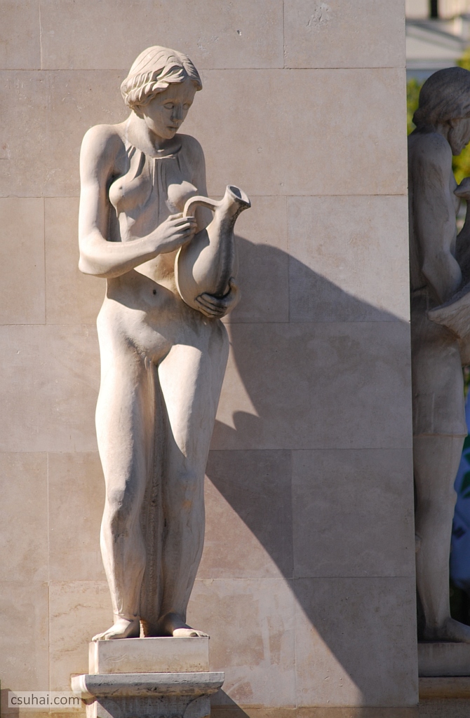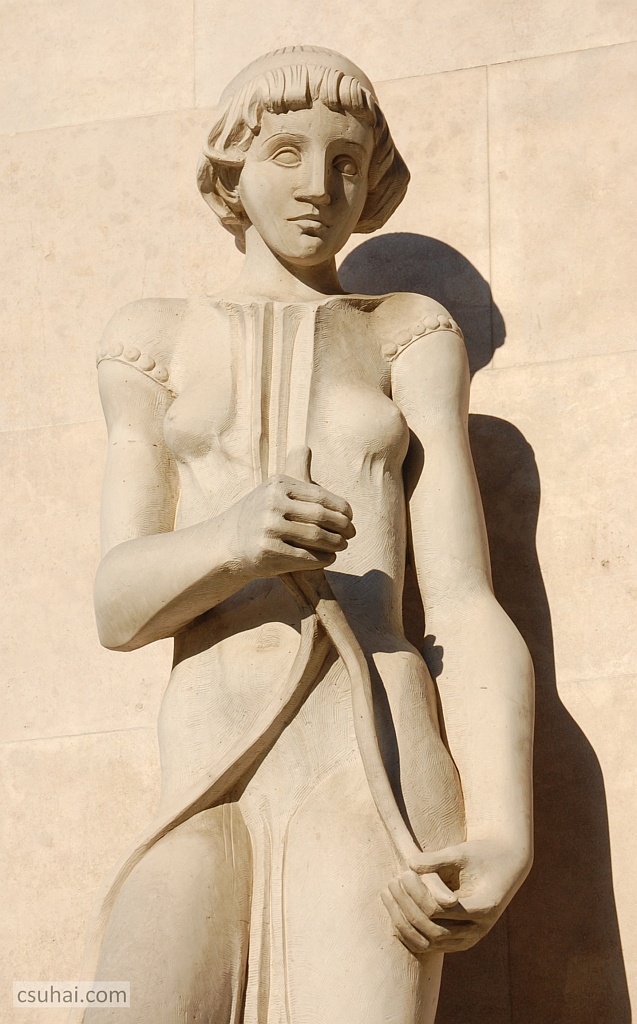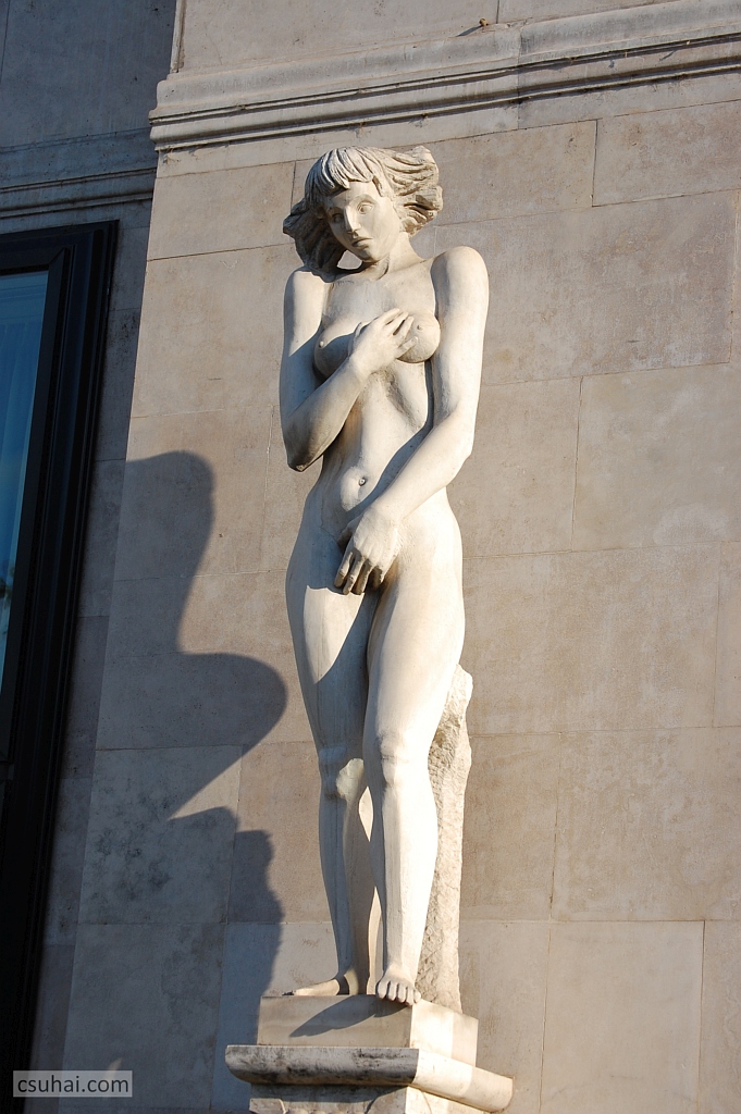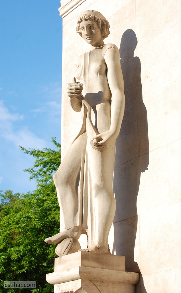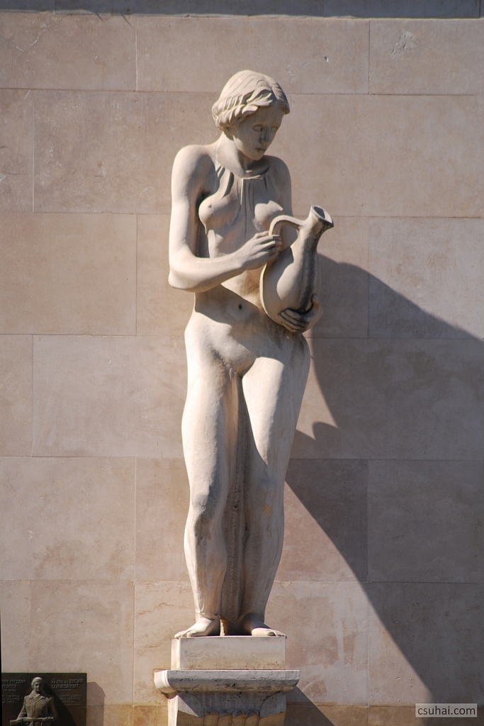 1940-ből, a Dunára néző főépület bejárata előtt Sényei Károly négy hatalmas nőszobra, a mérnöki munka négy szakát bemutató allegória. Budapest ostromakor a folyó pesti oldaláról az oroszok, hogy csak kettő vagy öt vagy tíz vagy száz közülük, ez nem bizonyított, ahogy filmfelvétel sincs róla, azzal játszottak, hogy géppuskával célba lőttek, ezeknek a több mint három méteres szobroknak a fejeit vették célba.